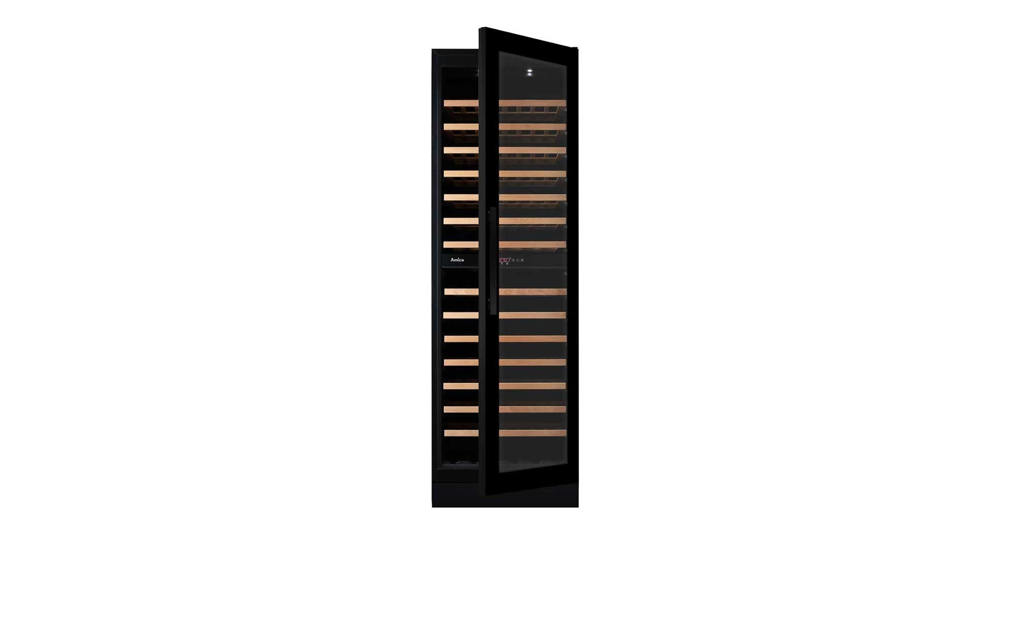 Der unterbaufähige Weintemperierschrank im X-Type Design ist in Schwarz gehalten und hat Abmessungen von ca. 176,8 x 59,5 x 61,5 cm. Er bietet Platz für bis zu 117 Bordeauxflaschen mit einem Fassungsvermögen von 0,75 Litern. Der Gesamtnutzinhalt beträgt 338 Liter.