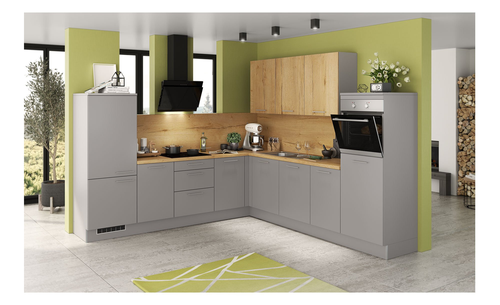 Korpus und die Fronten der Unterzeile sind komplett Arktisgrau, die Fronten der Hängeschränke hingegen sind in einer natürlichen Eiche Goldbraun Nachbildung gehalten. Die Arbeitsplatte ist ebenfalls in diesem Design gestaltet.