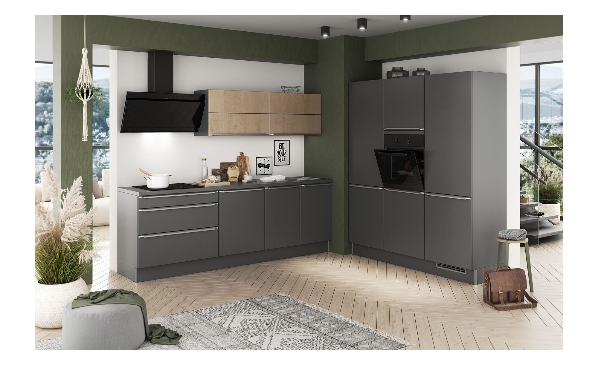 Am Korpus, der Arbeitsplatte und den Fronten der Unterzeile ist die Küche im stilvollen Farbton Graphit Nachbildung designt. Lediglich die Vorderseiten der Hängeschränke heben sich davon mit ihrem Dekor Toffee auf interessante Weise ab. Für eine lange Lebensdauer wurden diese Oberflächen mit Melaminharz beschichtet, die übrigen sind lackiert.