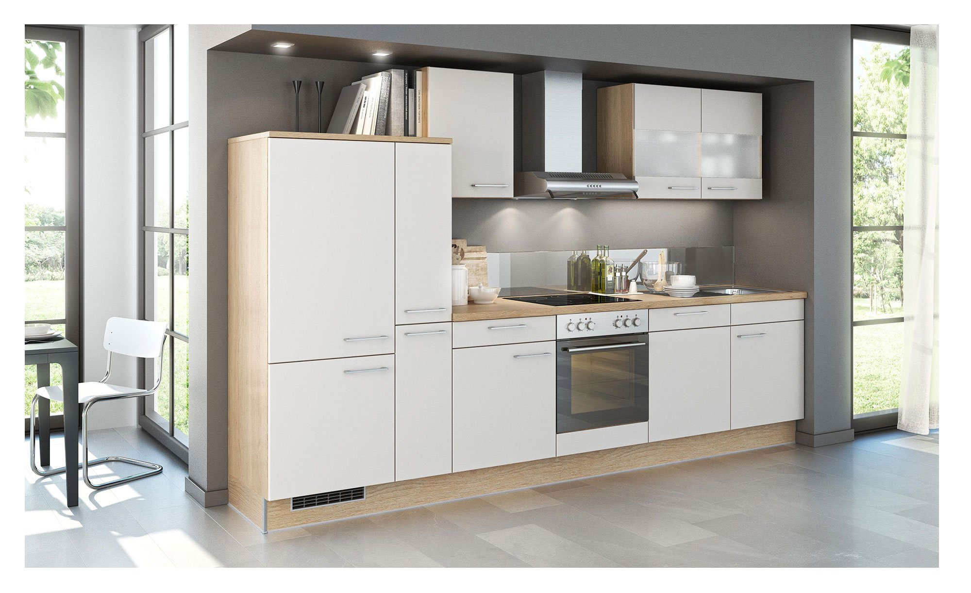 Auch in Sachen Funktionalität kann die Küchenzeile punkten. Eine komplette Ausstattung mit E-Geräten ist ebenso selbstverständlich wie jede Menge Stauraum. Hervorzuheben sind hier vor allem die Hängeschränke, aber auch ein geräumiger Seitenschrank bietet viel Platz für Ihr Küchenzubehör. Eine kratzfeste Melaminharzbeschichtung sowie Segmentglastüren in zwei der Hängeschränke vervollständigen die funktionale Ausstattung.
