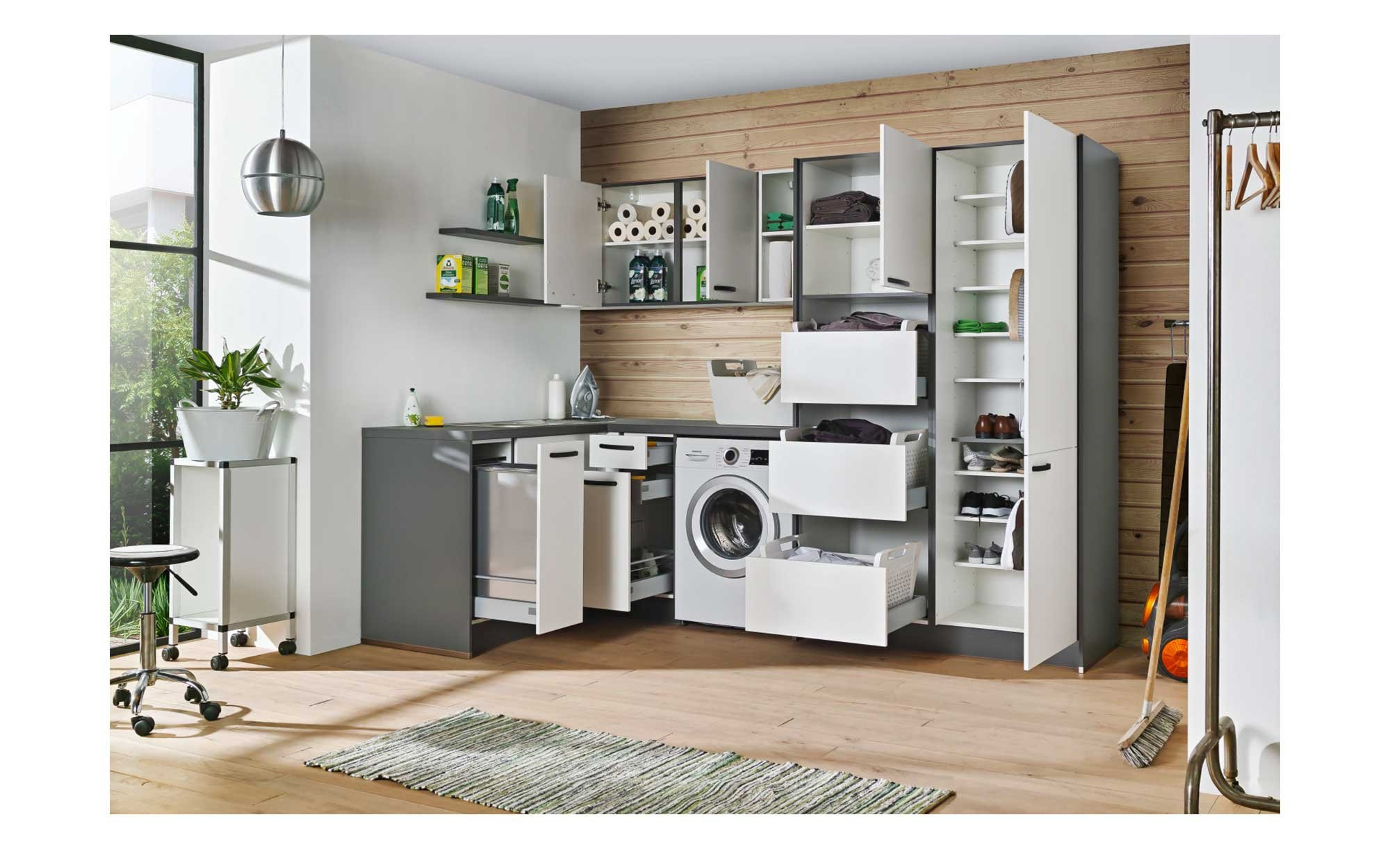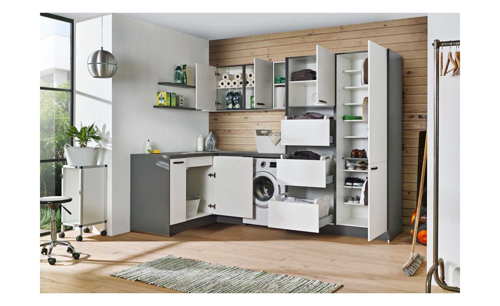 Mit Hilfe von schwarzen Metallgriffen lassen sich die zahlreichen Schränke öffnen. Genau wie die integrierten Wandregale bieten sie jede Menge Stauraum. Auch an genügend Platz zur Unterbringung Ihrer Waschmaschine wurde gedacht.