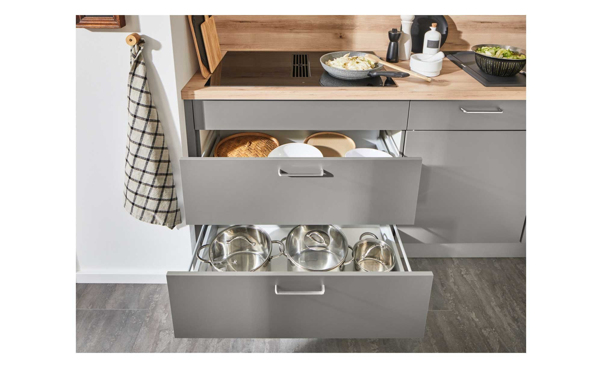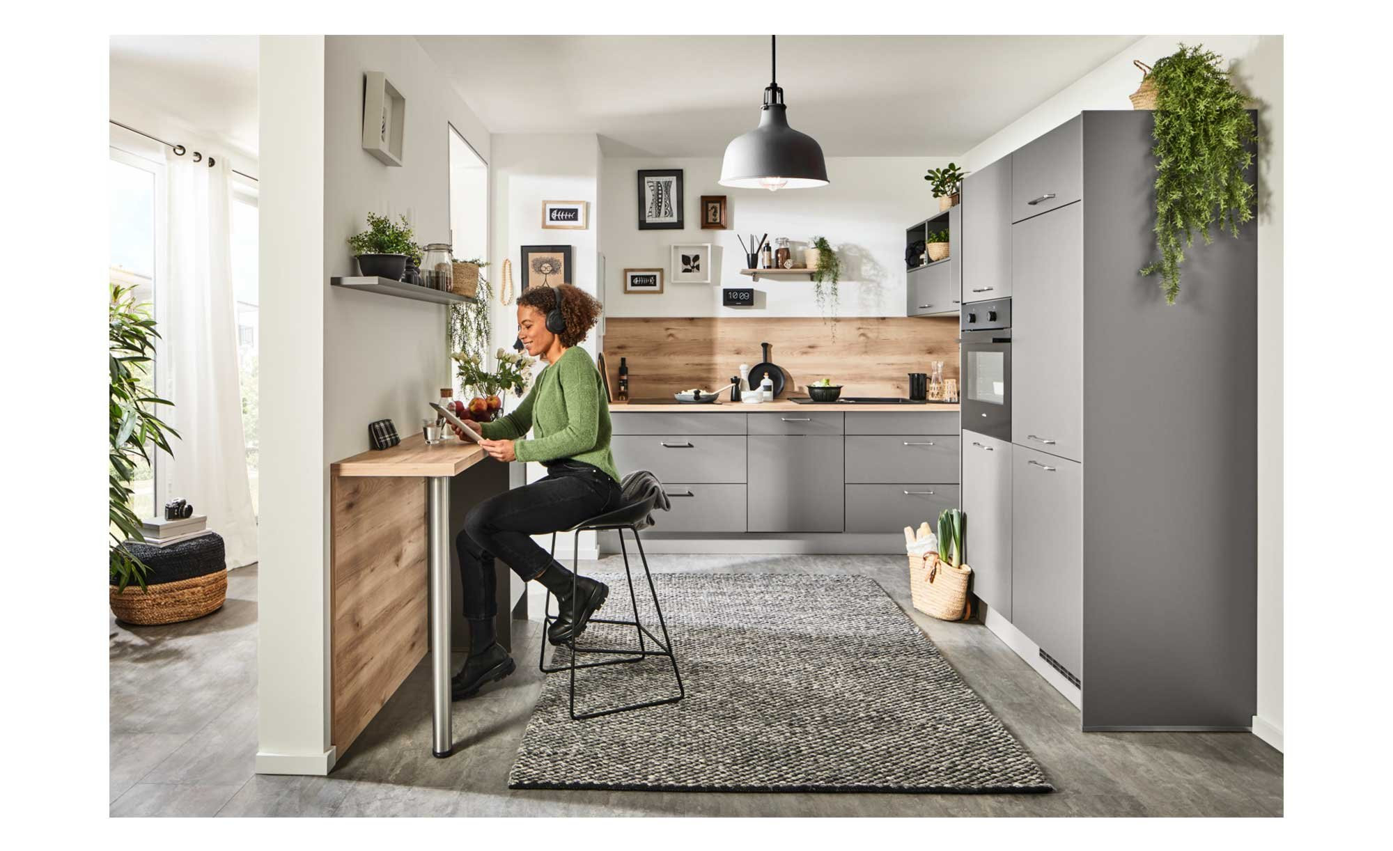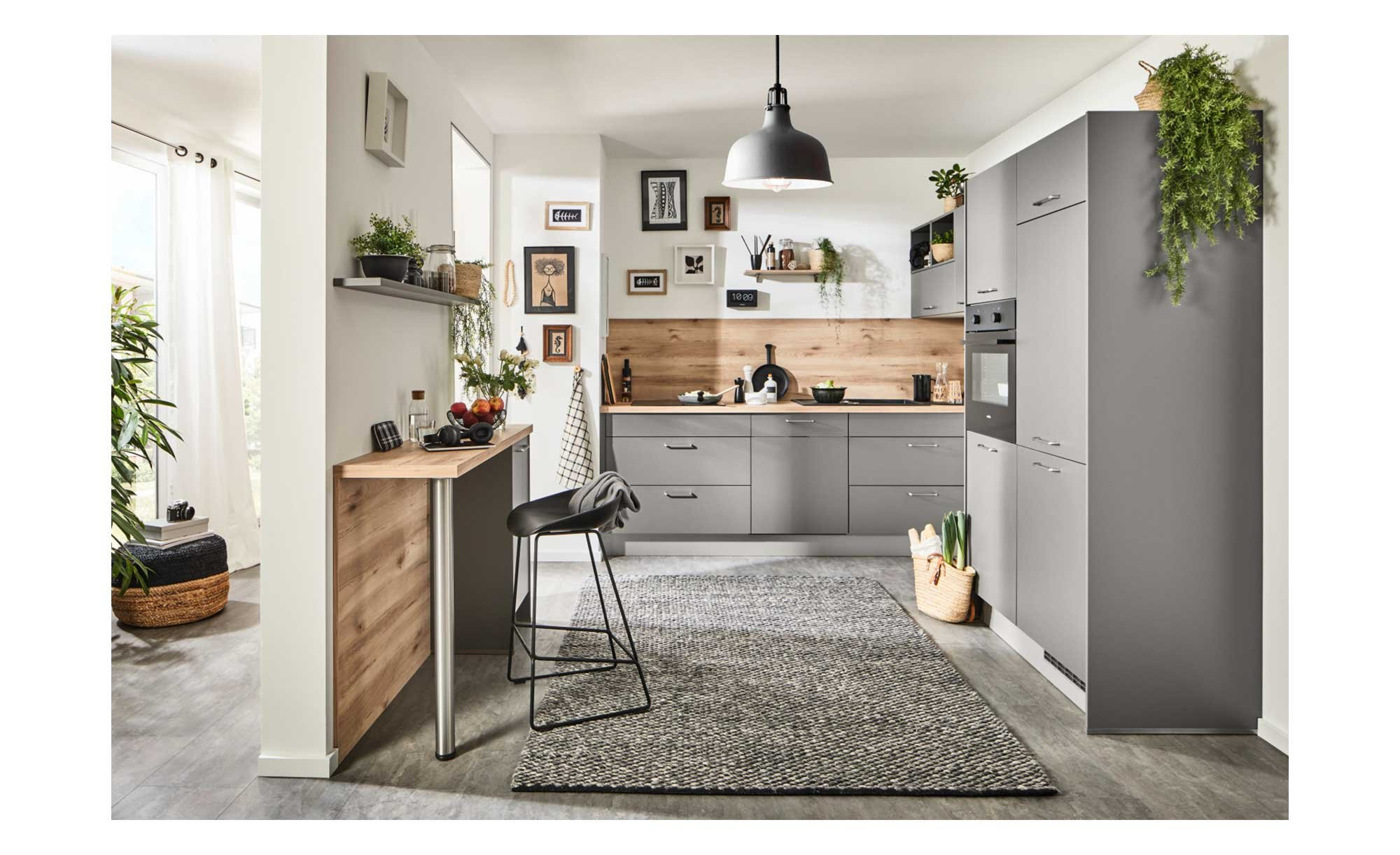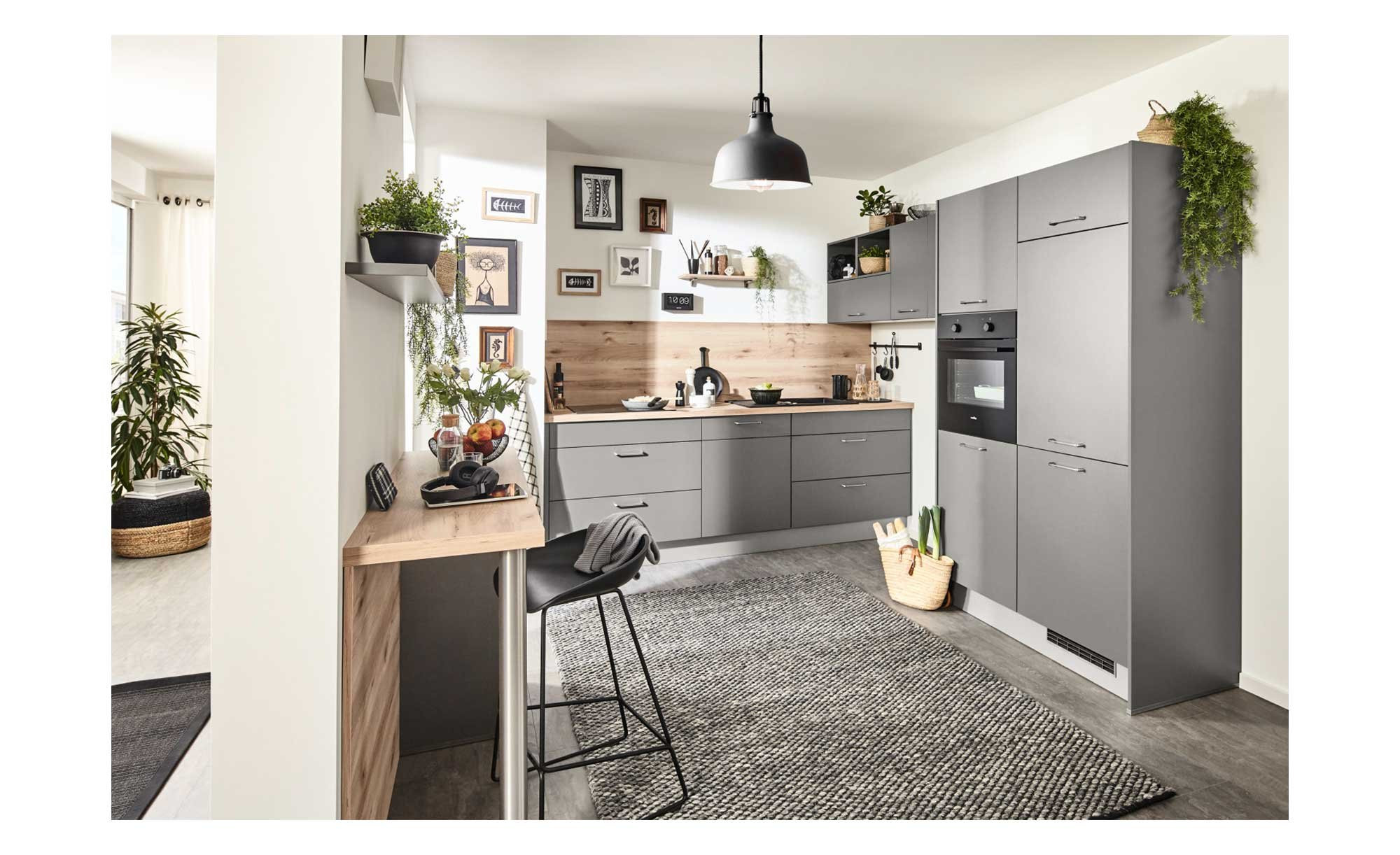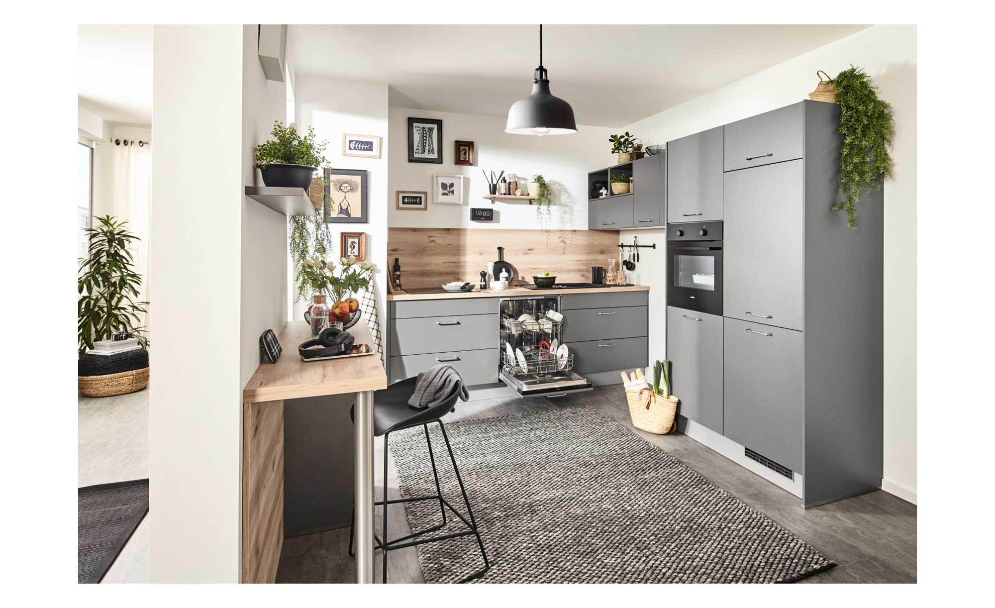 Besonders viel Stauraum liefert ein ca. 145 cm umfassender Schrank. Außerdem gibt es ein Regal in Anthrazit und hochwertige Metallgriffe in Edelstahl-Optik. Die Essplatzlösung wurde direkt mit eingeplant. Für eine bequeme Nutzung empfängt Sie der Backofen in einer ergonomischen Höhe. Zum Angebot gehören außerdem ein Glaskeramikkochfeld, eine Wandhaube, ein Kühlschrank und ein Geschirrspüler.