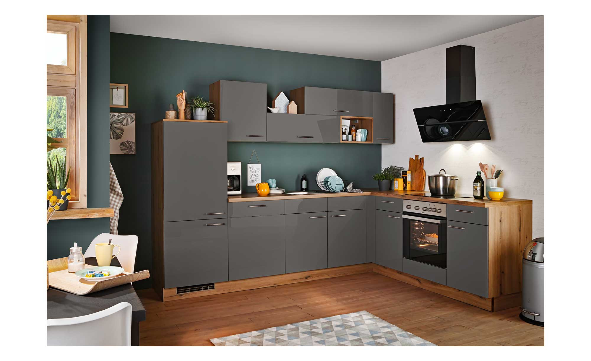 Für das Design des Korpus‘ und der Arbeitsplatte wurde das ansprechende Dekor Eiche astig verwendet. Dieses überzeugt mit einer naturnahen Maserung und sorgt für besonderes Flair. Einen passenden Kontrast hierzu bilden die anthrazitfarbenen Fronten der Ober- und Unterzeile. Hochglänzendes Lacklaminat sorgt für eine lange Lebensdauer und Unempfindlichkeit gegenüber äußeren Einflüssen. Die umlaufenden Dickkanten verhindern ebenfalls Verschleiß und decken darüber hinaus hässliche Fugen ab. Metallgriffe im Edelstahl-Look und die hochwertige Spüle aus Edelstahl fügen sich farblich perfekt ein.