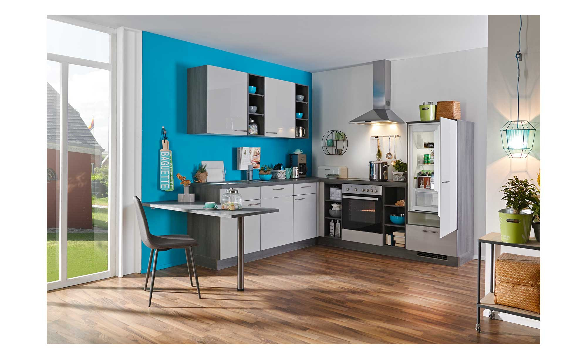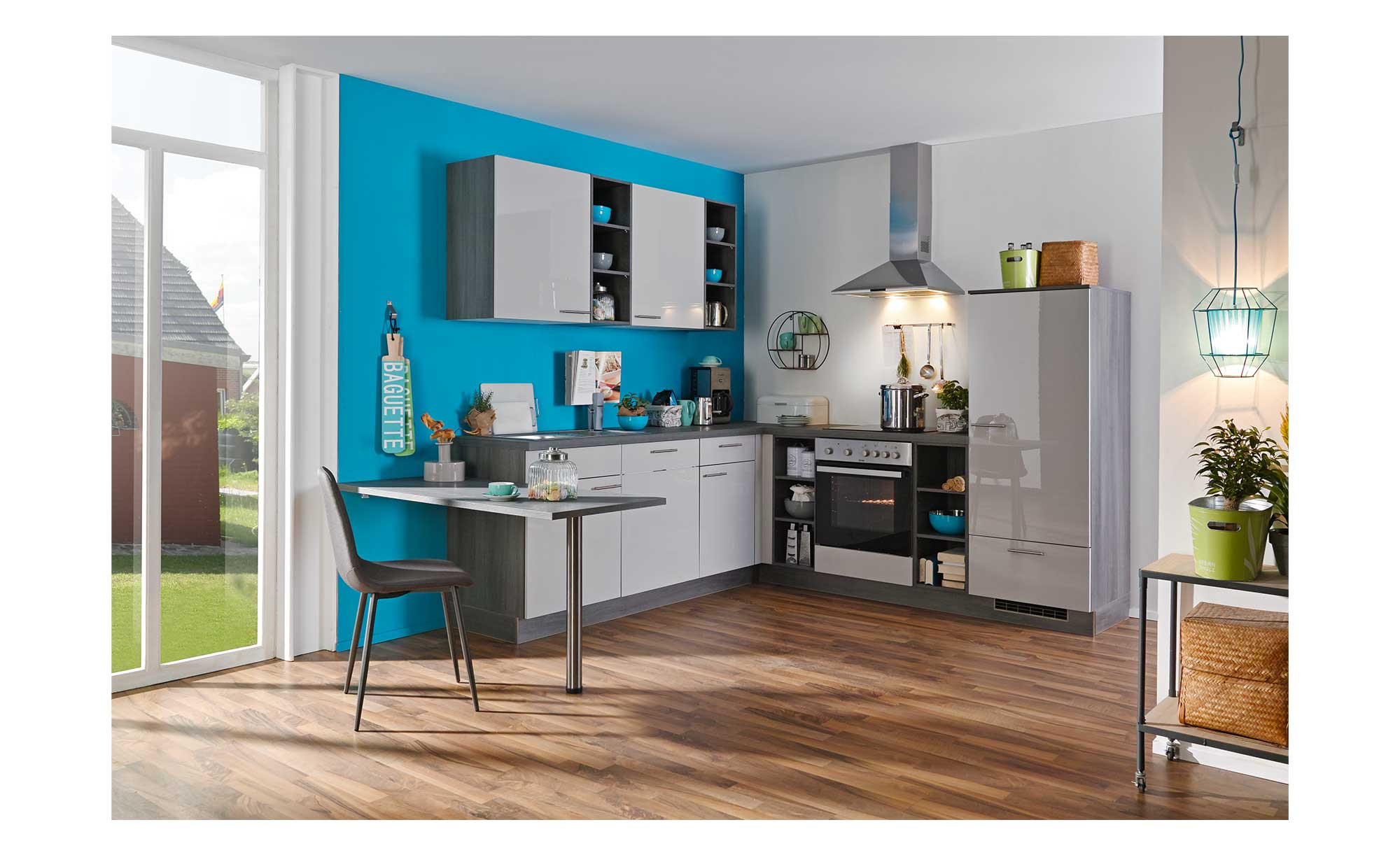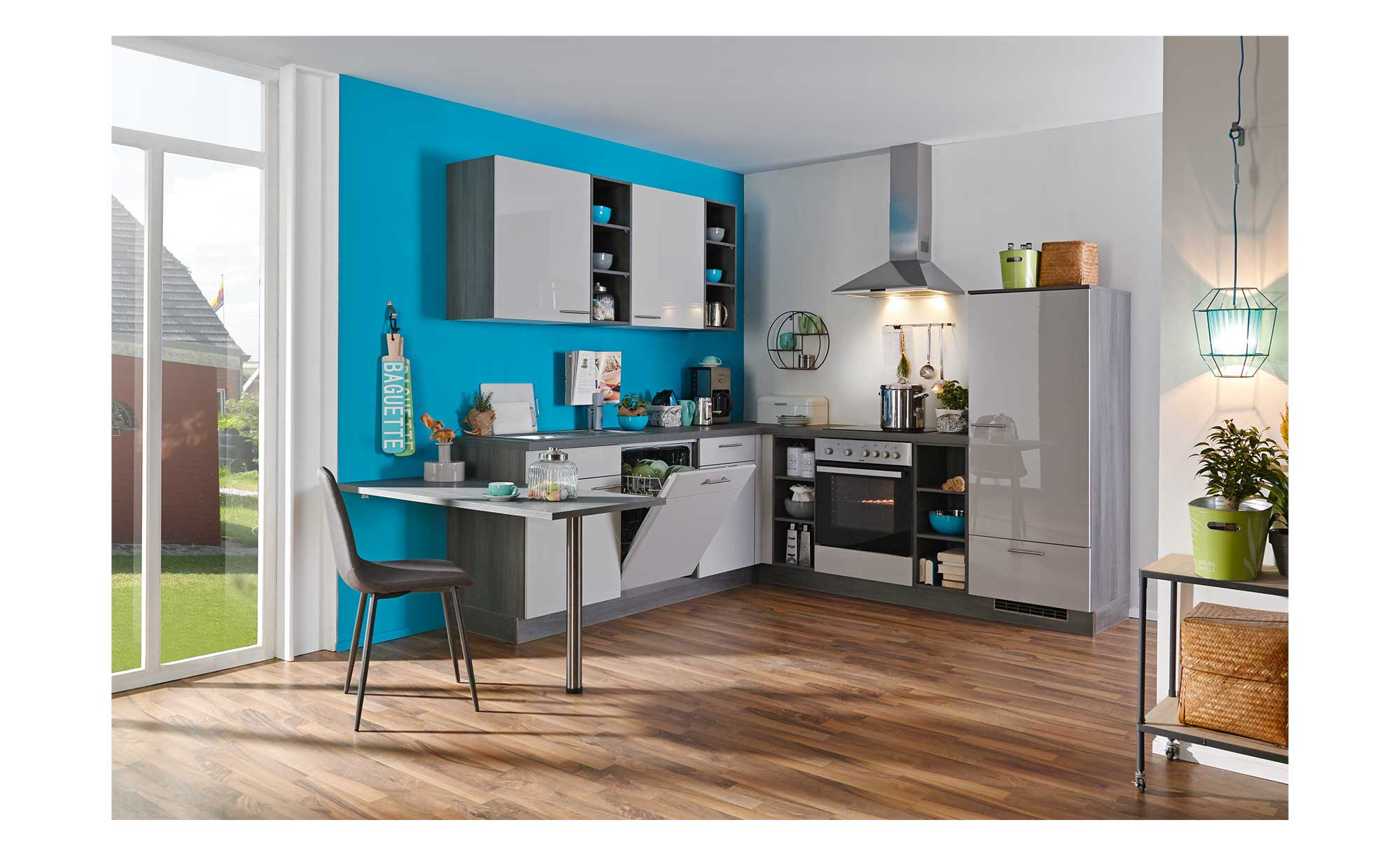 Die Fronten von Unter- und Oberschränken sind in hochglänzendem Hellgrau designt und durch die Lichtspiegelungen ein richtiger Blickfang. Korpus, Arbeitsplatte und offene Zwischenbauregale präsentieren sich in dunklerer Eiche grau. Verarbeitet wurde hochwertiges Lacklaminat mit umlaufender Dickkante. Metallgriffe in Edelstahloptik vervollständigen das Design. Zudem ist ein Ansatztisch integriert, an dem Sie mit zwei Personen zusammensitzen können.