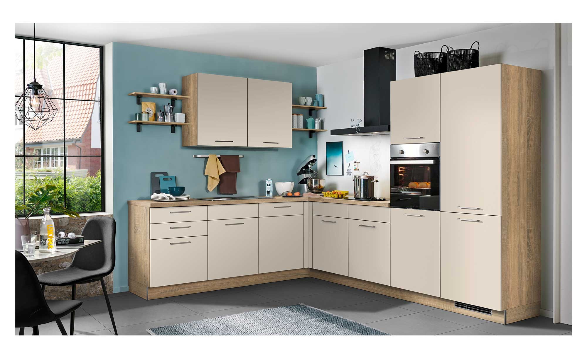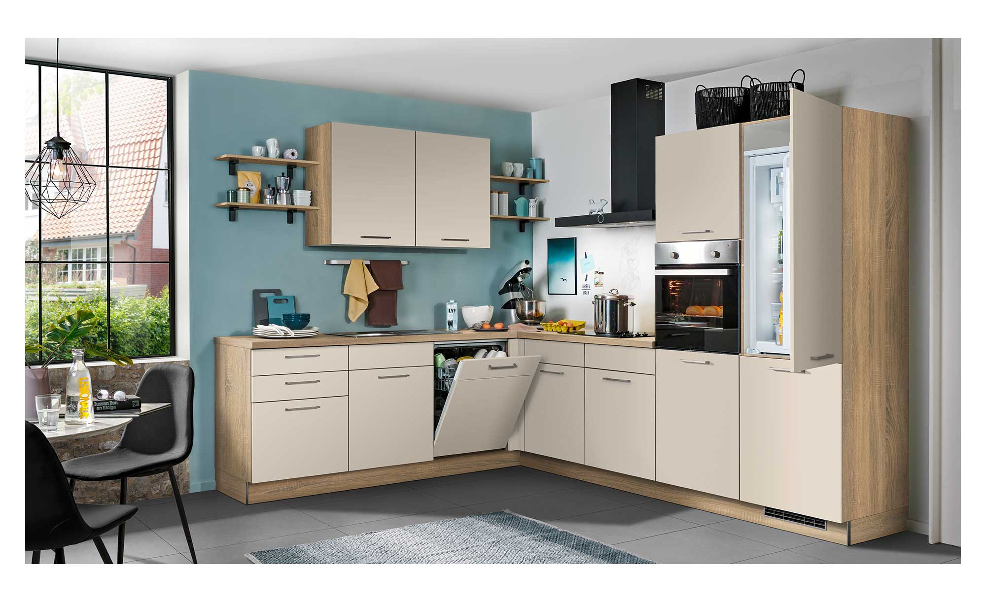 Die Express-Winkelküche Win verbindet ein zeitloses Erscheinungsbild mit Funktionalität und einem großen Angebot an Stauraum.