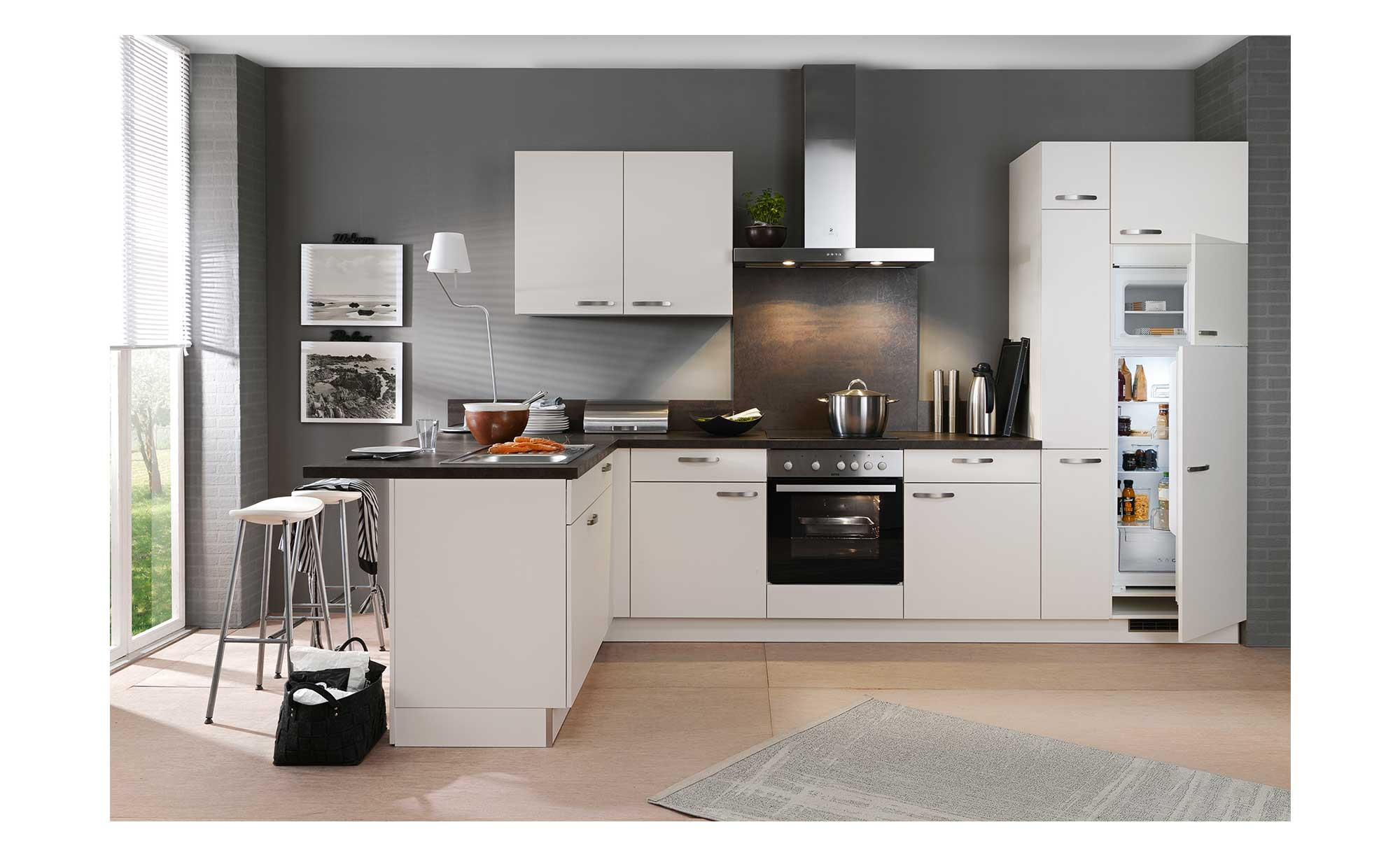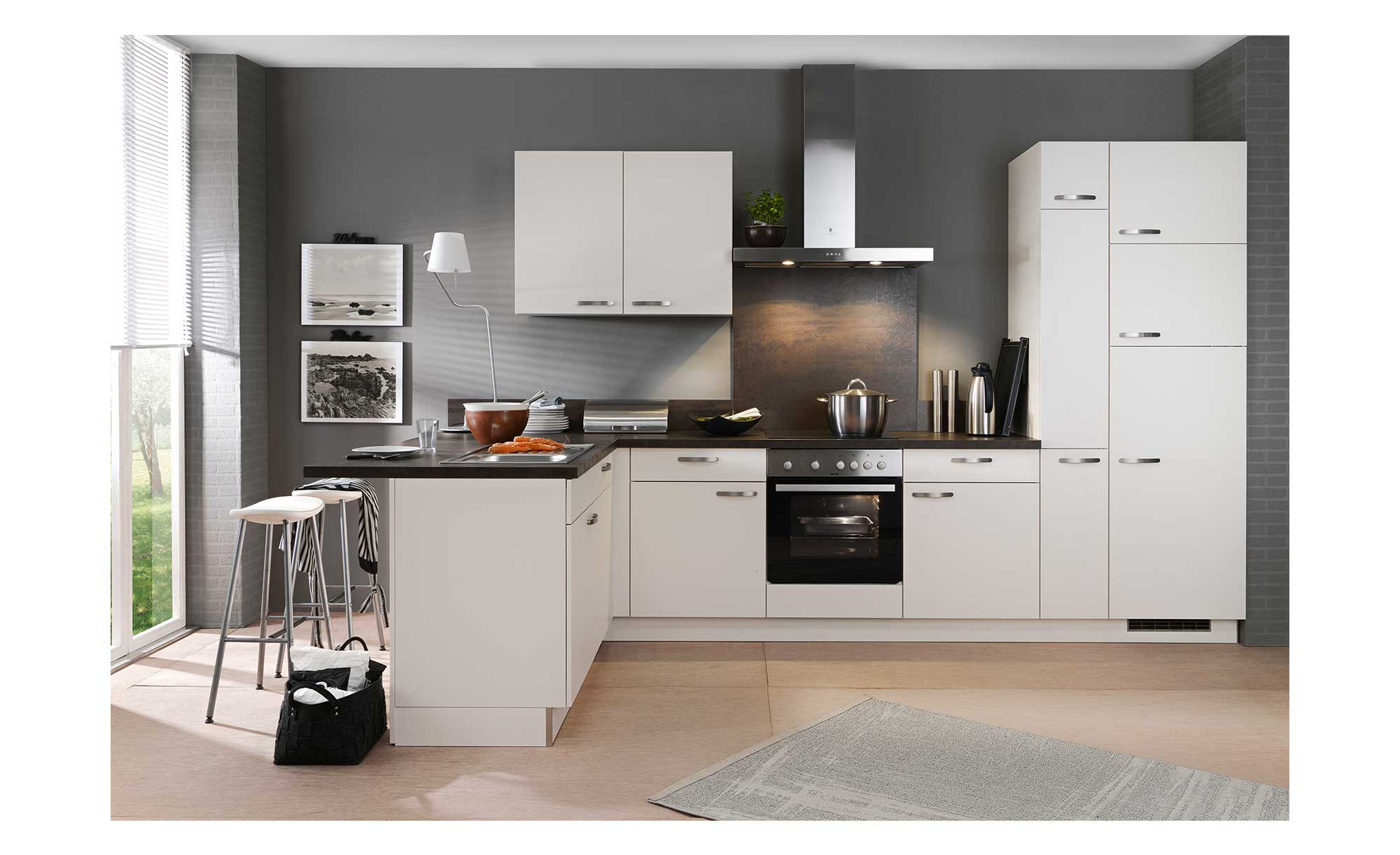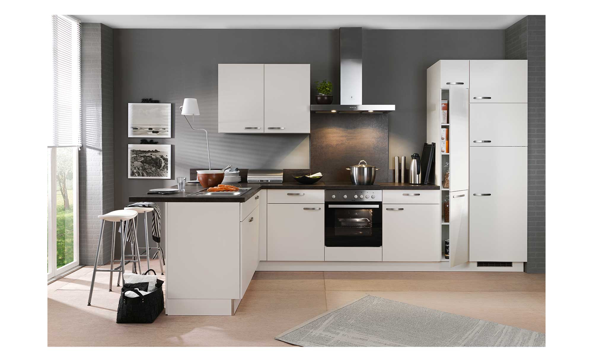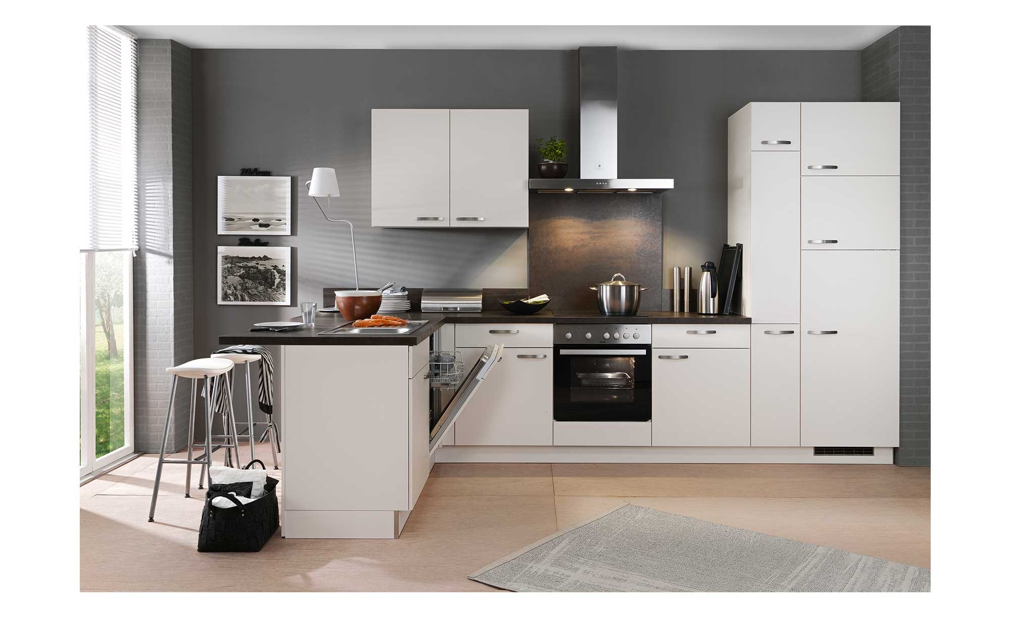 Die restlichen Frontelemente der Küche sind in mattem Magnolia gehalten. So tritt die Arbeitsplatte noch deutlicher hervor. Bügelstahlgriffe in Edelstahloptik vervollständigen das Design. Selbstverständlich gehören auch jede Menge Stauraumoptionen und hochwertige Elektrogeräte zur Ausstattung der Küche. Zudem sind die Oberflächen mit mattem Melaminharz beschichtet und deswegen besonders strapazierfähig. Eine umlaufende Dickkante beugt einer Fugenbildung vor und vereinfacht die Reinigung Ihrer neuen Küche.