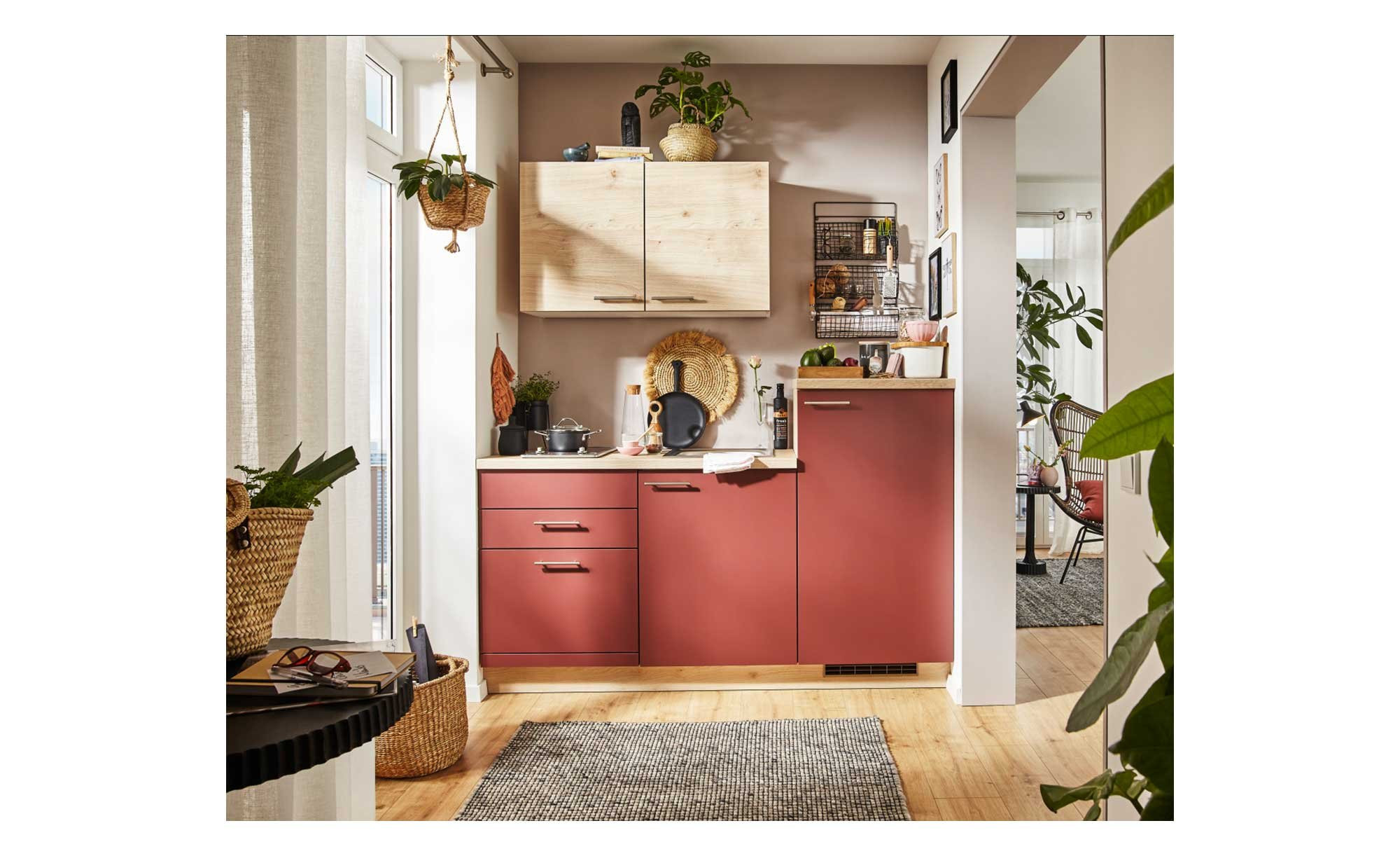 Die Küchenzeile ist ca. 180 cm lang und am Korpus, dem Sockel sowie der Arbeitsplatte im Dekor Wildeiche gestaltet. Auch die Fronten der Hängeschränke tragen dieses Muster, während die der Unterzeile mit ihrem warmen Karminrot unmittelbar ins Auge stechen. Eine Melaminharzbeschichtung und umlaufende Dickkanten verhindern zuverlässig Verschleiß. Abgerundet wird das Bild durch edelstahlfarbige Griffe.