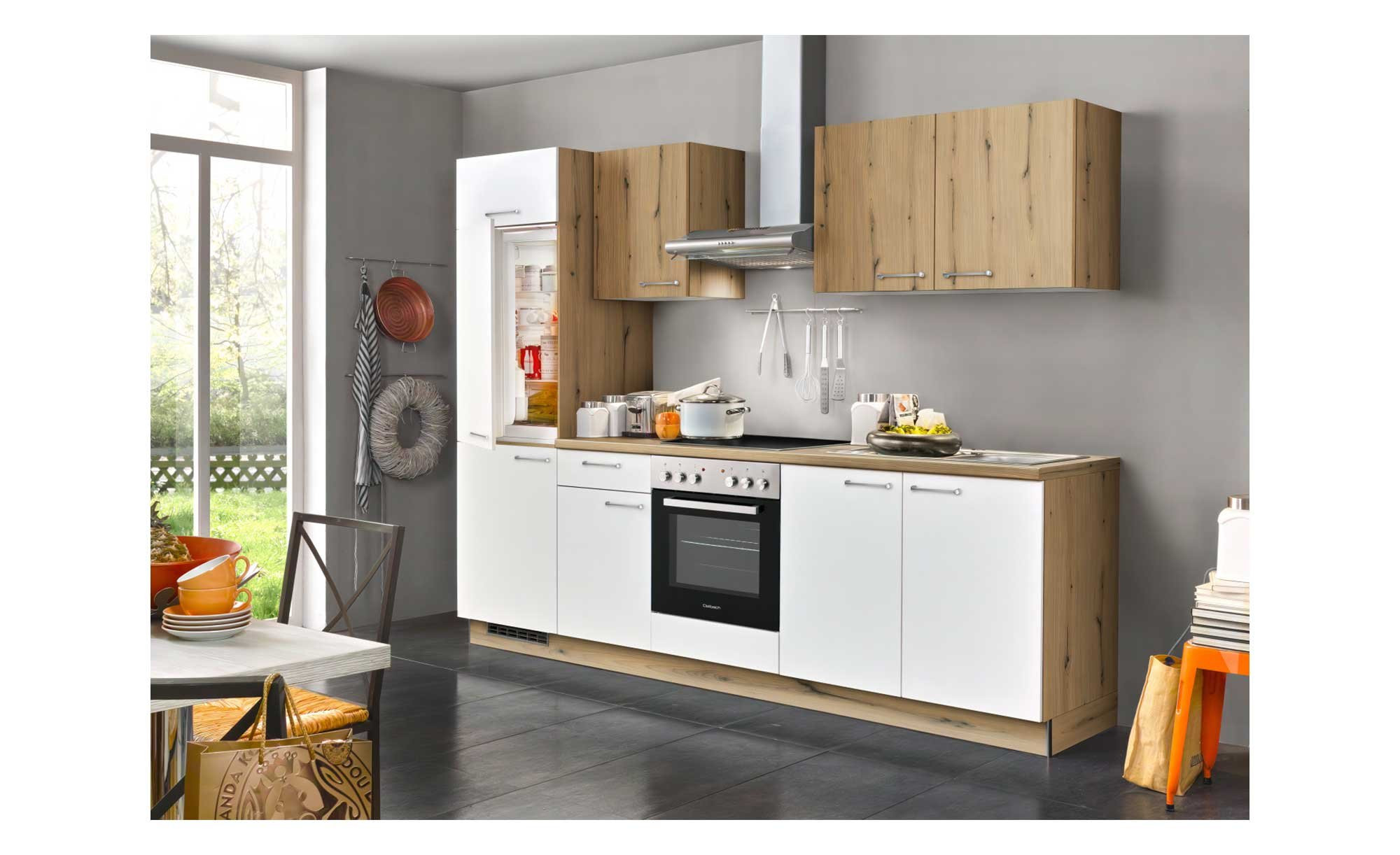 Gestaltet ist die Unterzeile durchgehend matt-weißen Fronten. Diese werden von Korpus, Sockel und Arbeitsplatte und Hängeschränke in Eiche Astig stilvoll eingerahmt. Bügelgriffe in Edelstahloptik verleihen der Küchenzeile einen Hauch Eleganz. Dank einer Melaminharzbeschichtung sind alle Oberflächen strapazierfähig und kratzbeständig – beste Voraussetzungen, damit Ihre neue Küche auch langfristig schön aussieht.