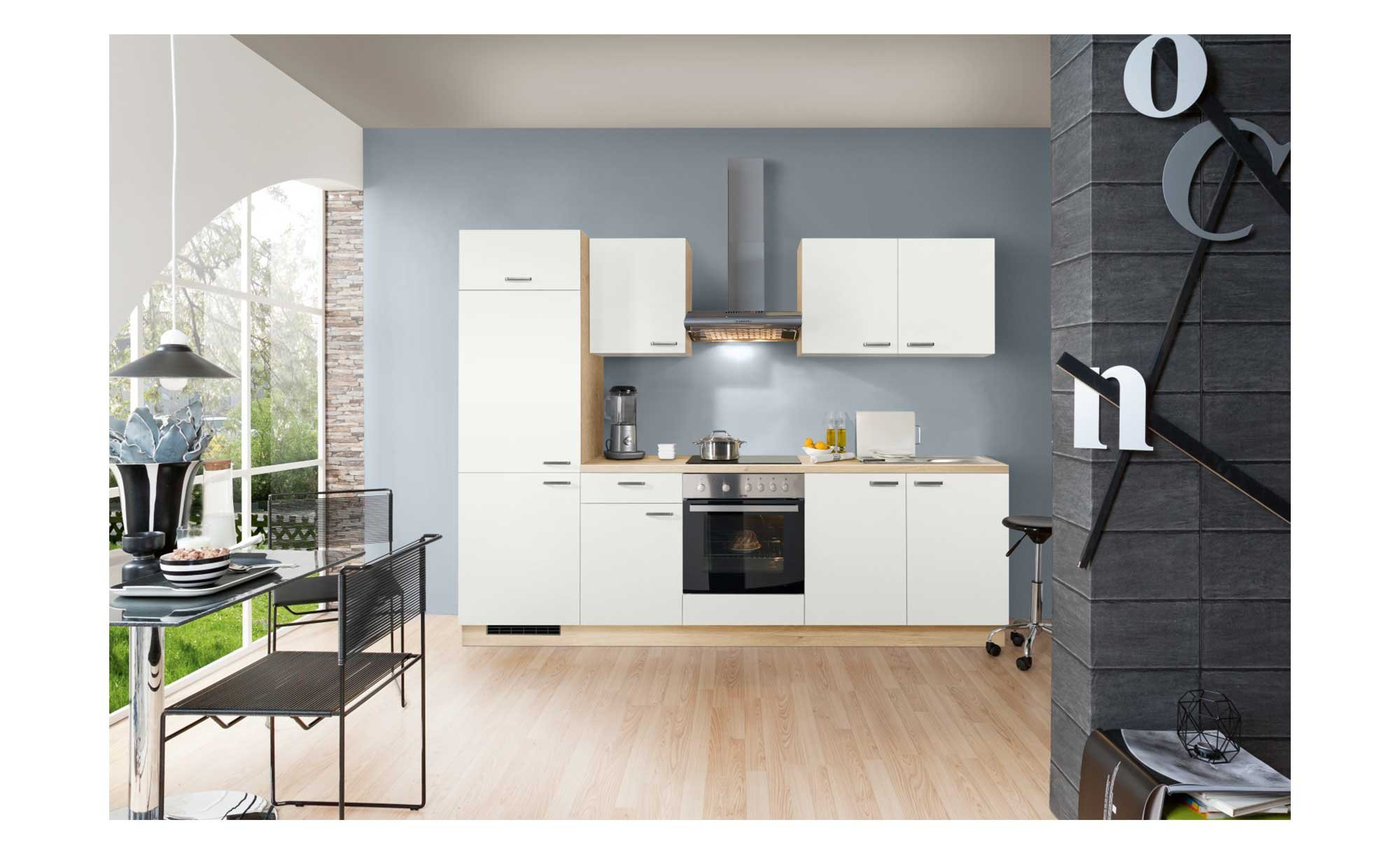 Korpus, Sockel und Arbeitsplatte der ca. 270 cm langen Küche überzeugen mit ihrem natürlichen Flair. Sie sind im Dekor Wildeiche gestaltet, welches hervorragend mit den matt-weißen Fronten harmoniert. Damit Sie lange Freude an diesen haben, verfügen sie über eine Melaminharzbeschichtung und umlaufende Dickkanten. Die Griffe begeistern in Edelstahl-Optik.