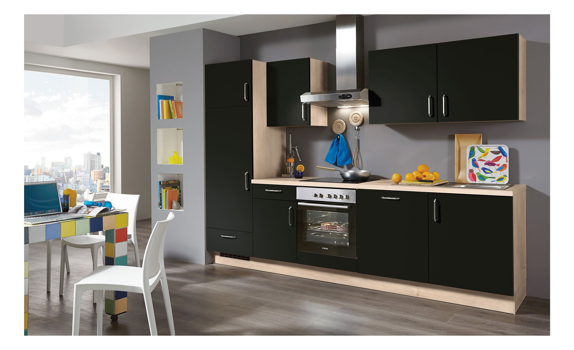 Die ca. 290 cm lange Zeile verfügt über einen Korpus und eine Arbeitsplatte in Eiche Montreal Nachbildung. Einen krassen Gegensatz dazu bilden die supermatten Lacklaminat-Fronten in Schwarz. Edelstahlfarbige Metallgriffe tragen einen weiteren Teil zum edlen Gesamtbild bei.