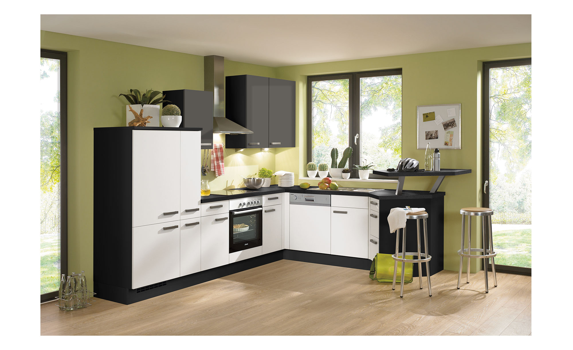 Bei der angebotenen Küche prallen mit dem schwarzen Korpus samt gleichfarbiger Arbeitsplatte und weißen Fronten absolute Kontraste aufeinander – auf gelungene Weise! Zusätzlich dürfen Sie sich an den Hängeschränken auf vulkangraue Vorderseiten freuen. Eine Melaminharz-Beschichtung schützt die Oberflächen vor Verschleiß. Ausgezeichnet ins Bild passen zudem die titanfarbigen Metallgriffe.