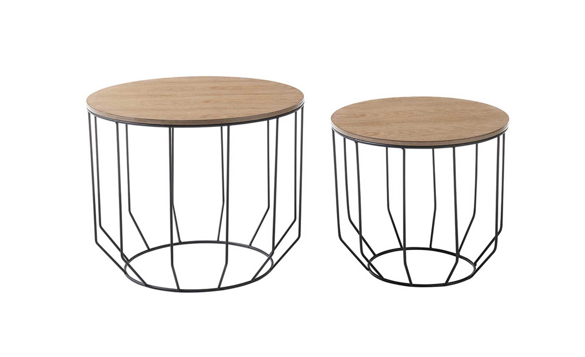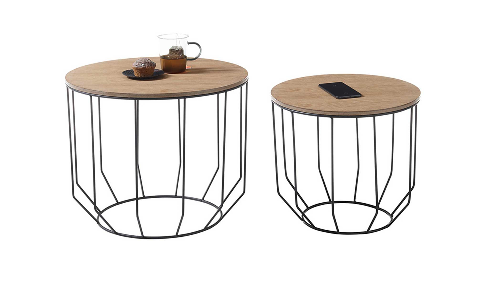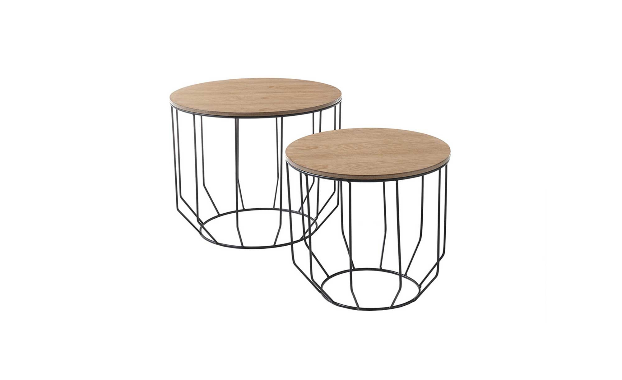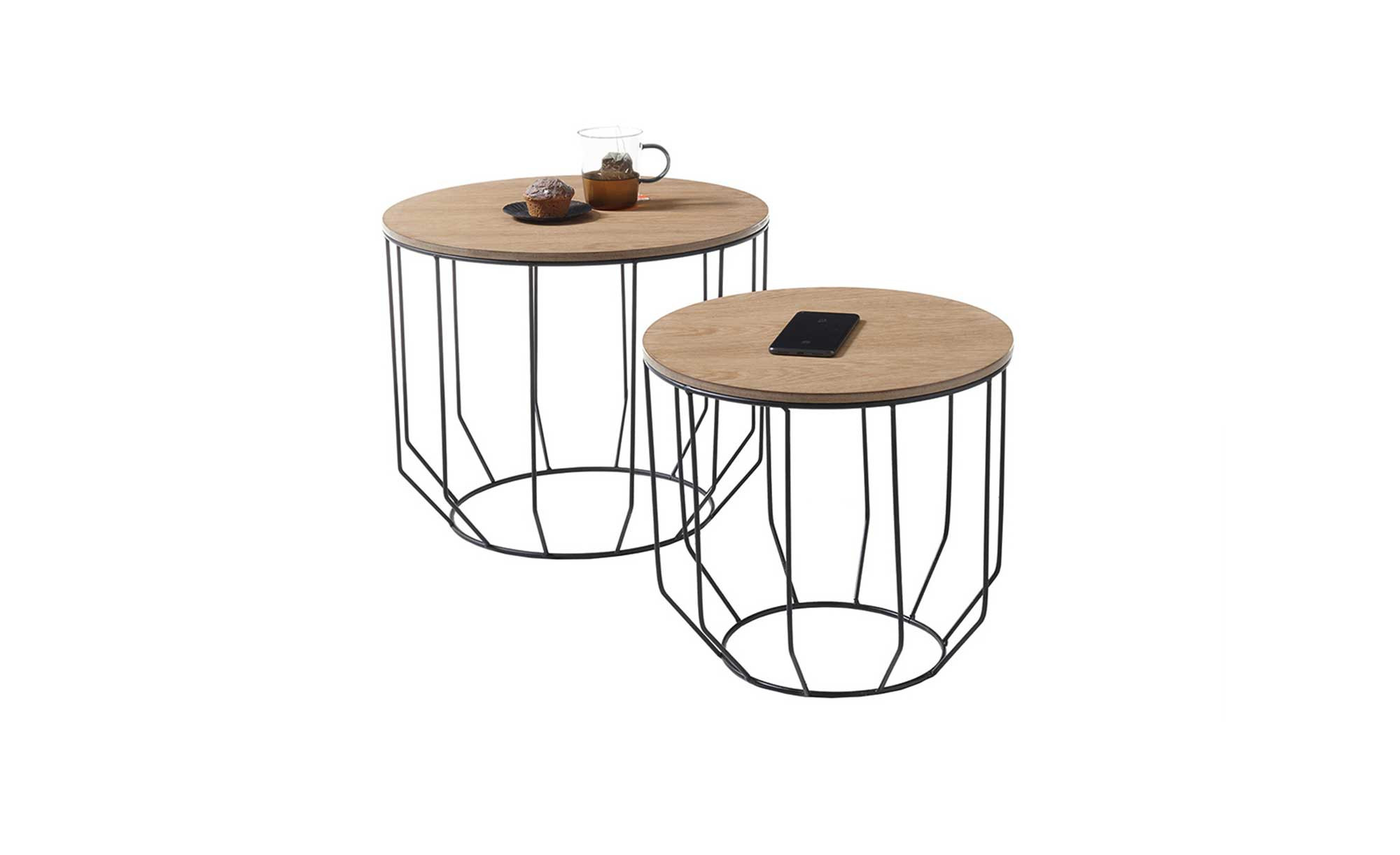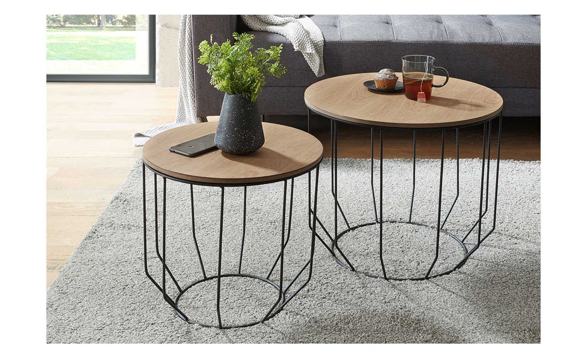 Die runden Platten der beiden Tische bestehen aus MDF und verfügen über ein geöltes Eiche-Furnier. Getragen werden sie jeweils von einem pulvergeschichteten Metallgestell in Schwarz. Dessen filigranes Design fügt sich perfekt ins Bild.