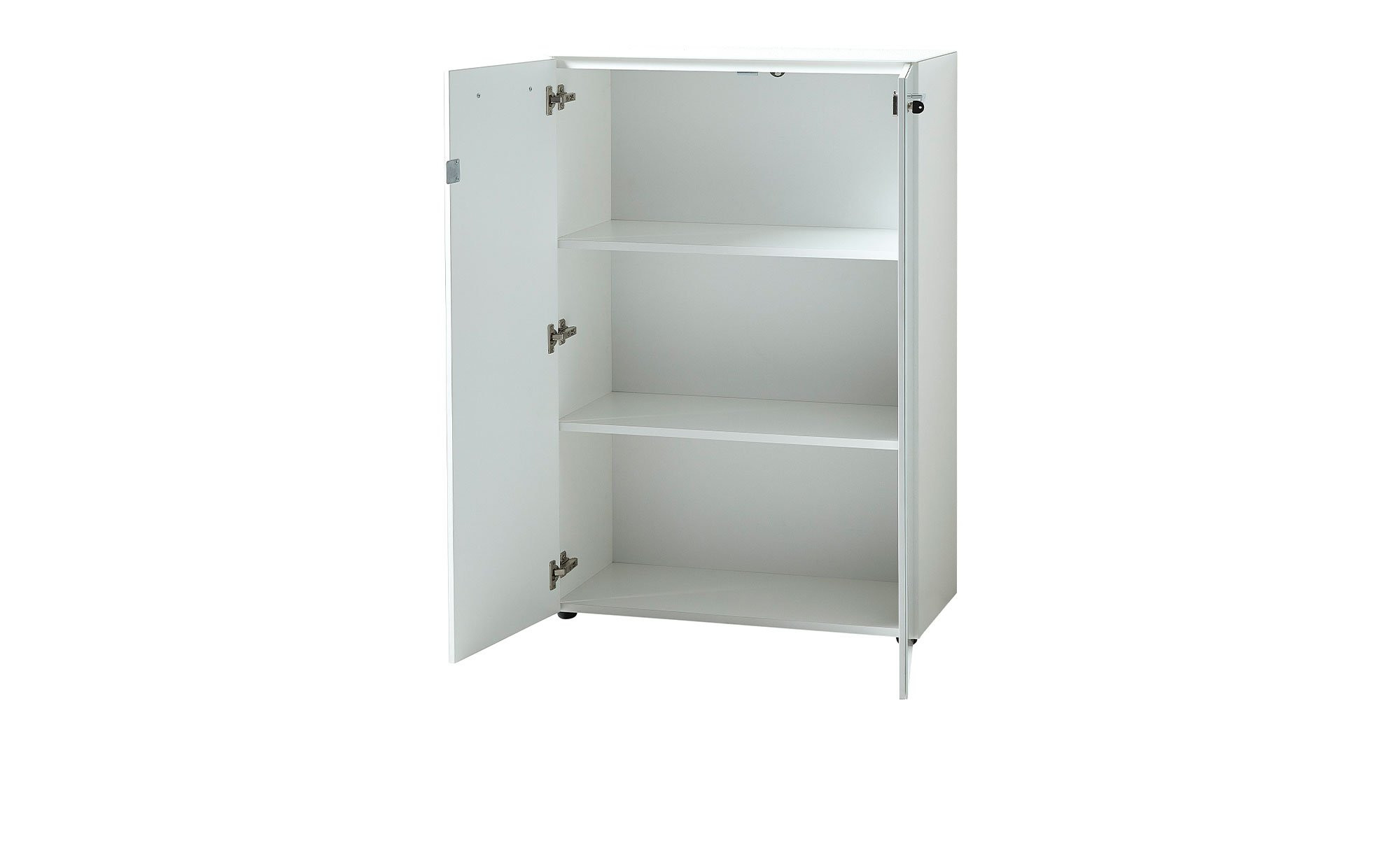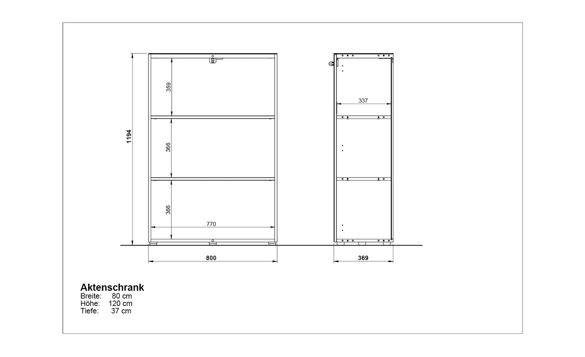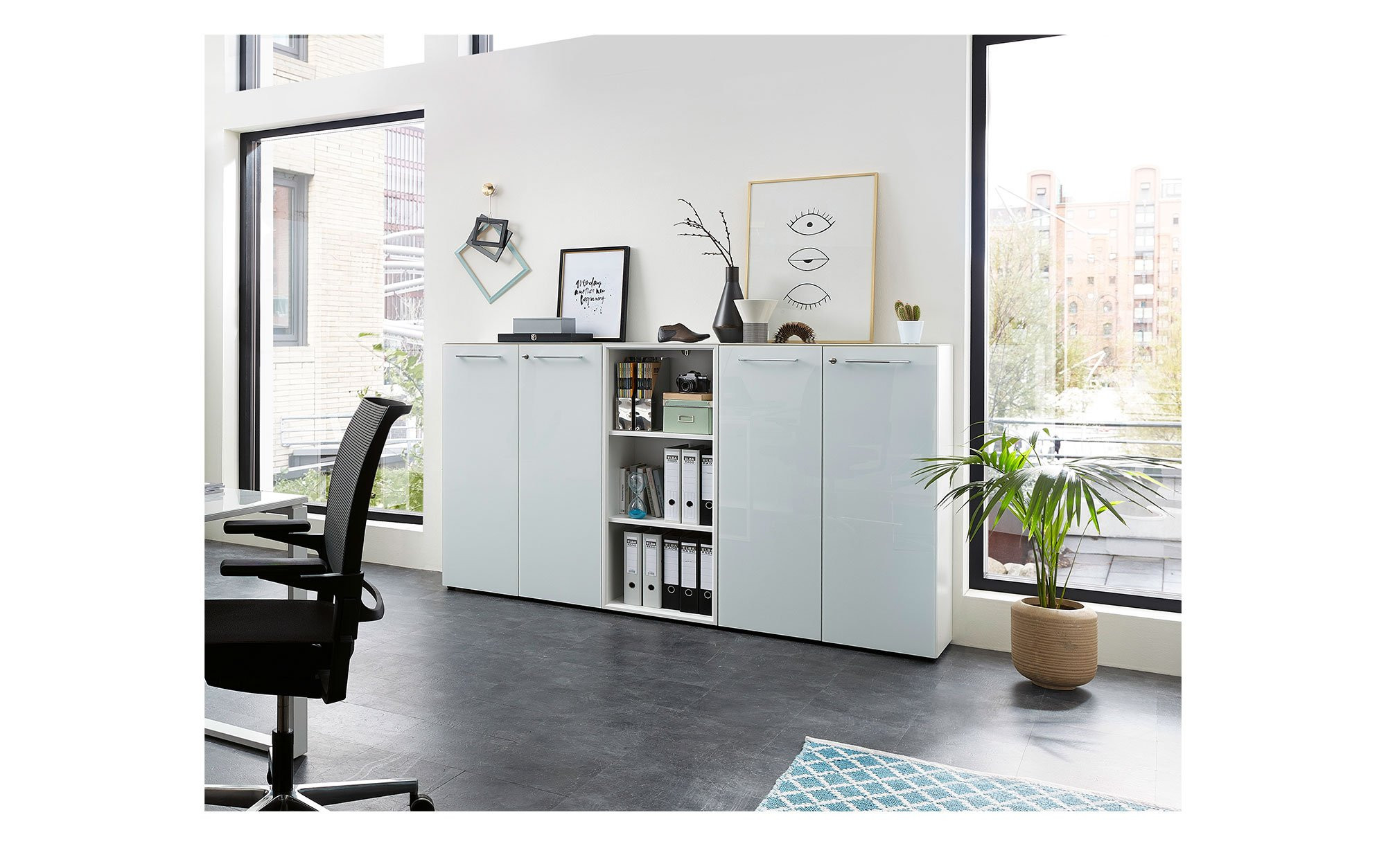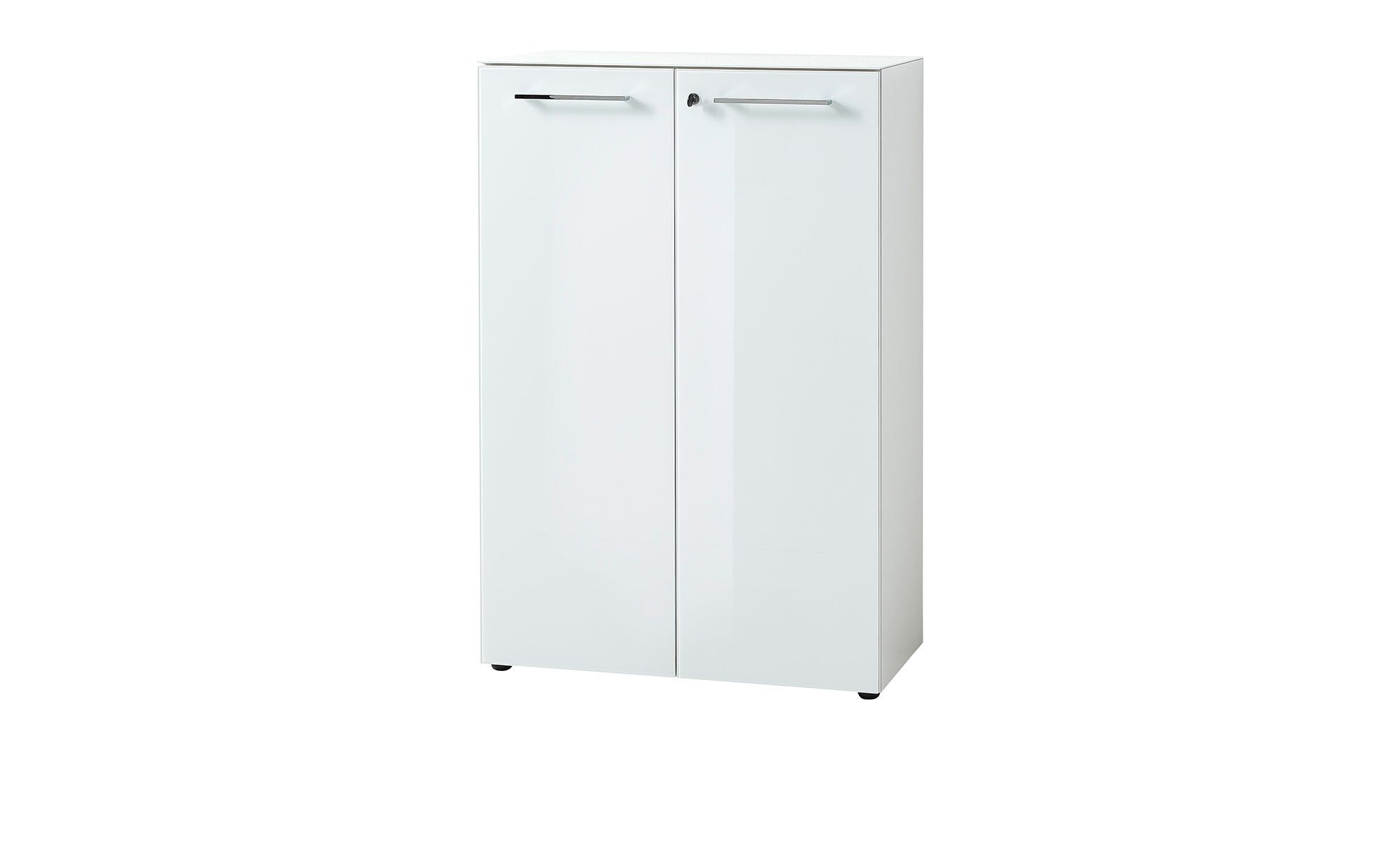 Neben schwarzen Kunststofffüßen runden auch verchromte Relinggriffe aus Metall das Bild ab. Mit ihnen lassen sich die beiden abschließbaren Türen des Aktenschranks öffnen und schließen. Sie verfügen über einen integrierten Dämpfer für eine langsame, sanfte und geräuschlose Nutzung.