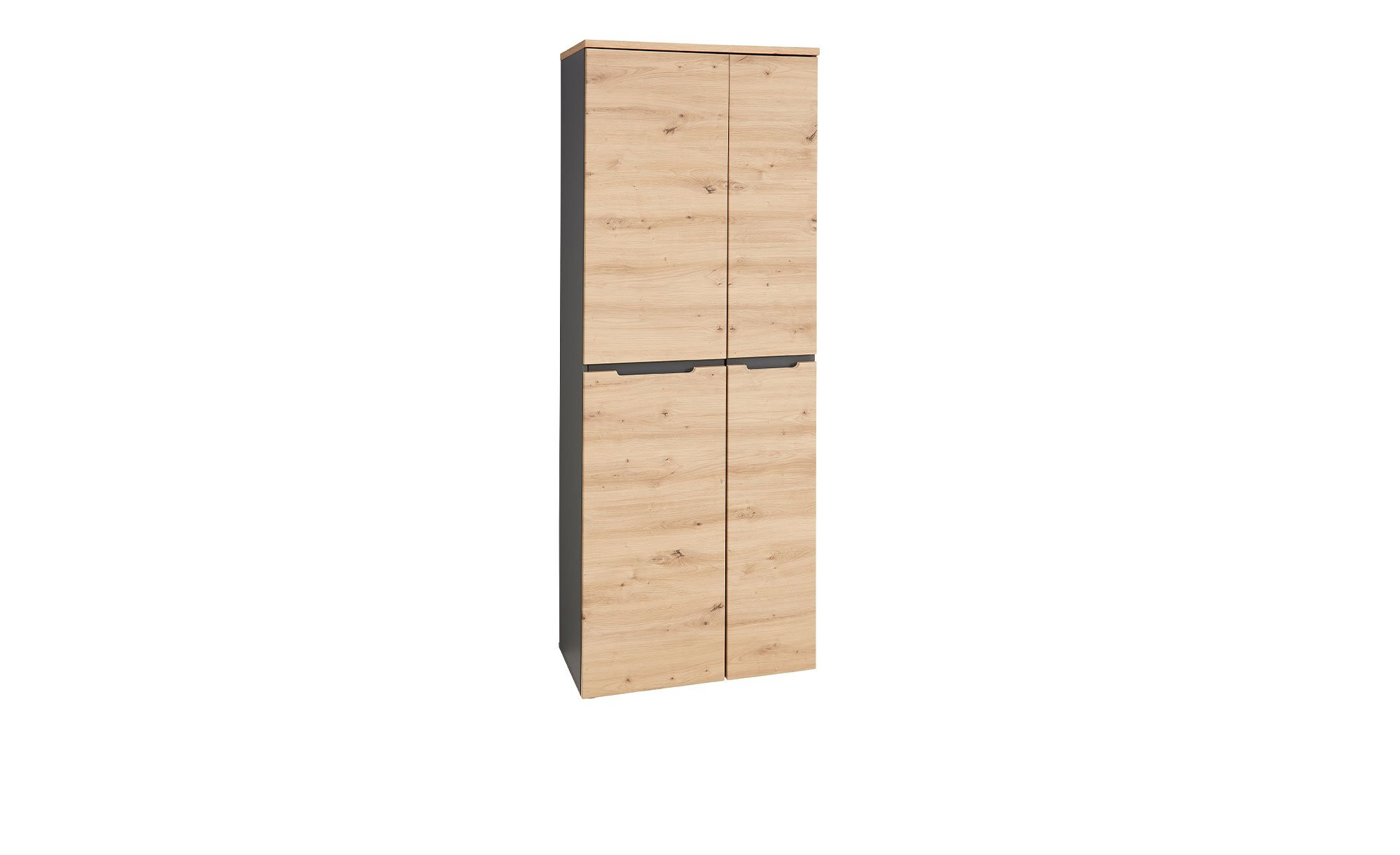 Während der aus Holzwerkstoff bestehende Korpus und die Rückwand des ca. 75 x 197 x 38 cm großen Schranks in einem stilvollen Graphit gehalten sind, sorgt die Front für einen Kontrast. Sie besteht aus MDF und begeistert mit einer freundlichen Artisan Eiche-Nachbildung. Als Füße fungieren schwarze Kunststoffgleiter.