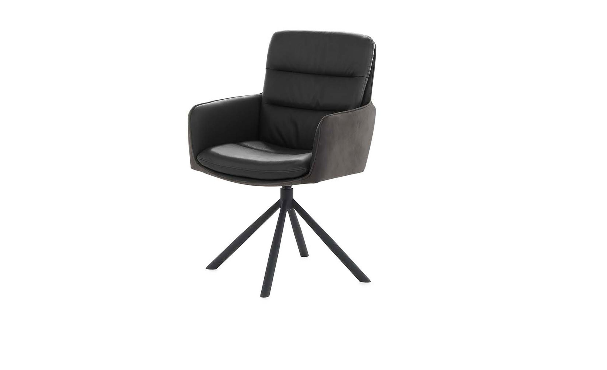 Die Vorderseite der Sitzschale ist mit schwarzem Echtleder bezogen, während die Rückseite aus Stoff (100 % Polyester, Vintage Anthrazit) gefertigt ist. Ein schwarzes Stativgestell aus Metall sorgt für Stabilität und verleiht dem Stuhl eine elegante Optik.
