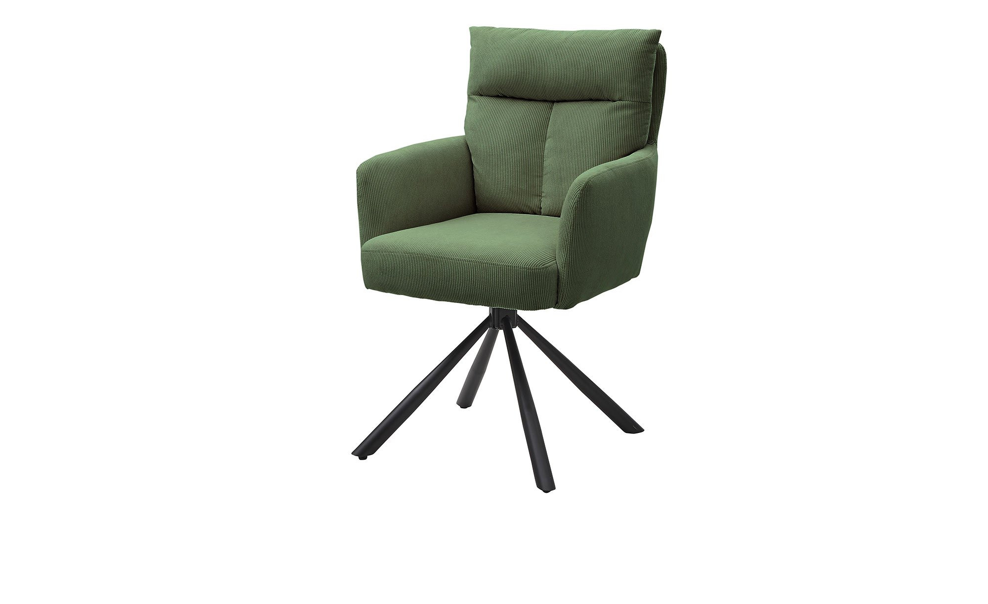 Der Bezug aus weichem Cordstoff (100 % Polyester) in Grün macht den Armlehnstuhl Sarah besonders bequem und pflegeleicht. Das schwarze Metallgestell mit Sternfuß sorgt für Stabilität und verleiht dem Stuhl eine moderne, elegante Optik.