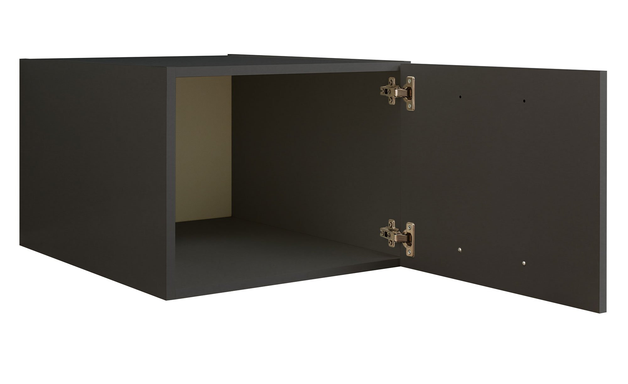 Der ca. 50 x 38 x 68 cm große Artikel besteht aus Holzwerkstoff und überzeugt durch anthrazitfarbene Oberflächen, die durch eine Melaminbeschichtung zuverlässig vor Kratzern und Abnutzung geschützt sind. Die Rückwand ist in Weiß und der Innendekor ist in Anthrazit gestaltet.