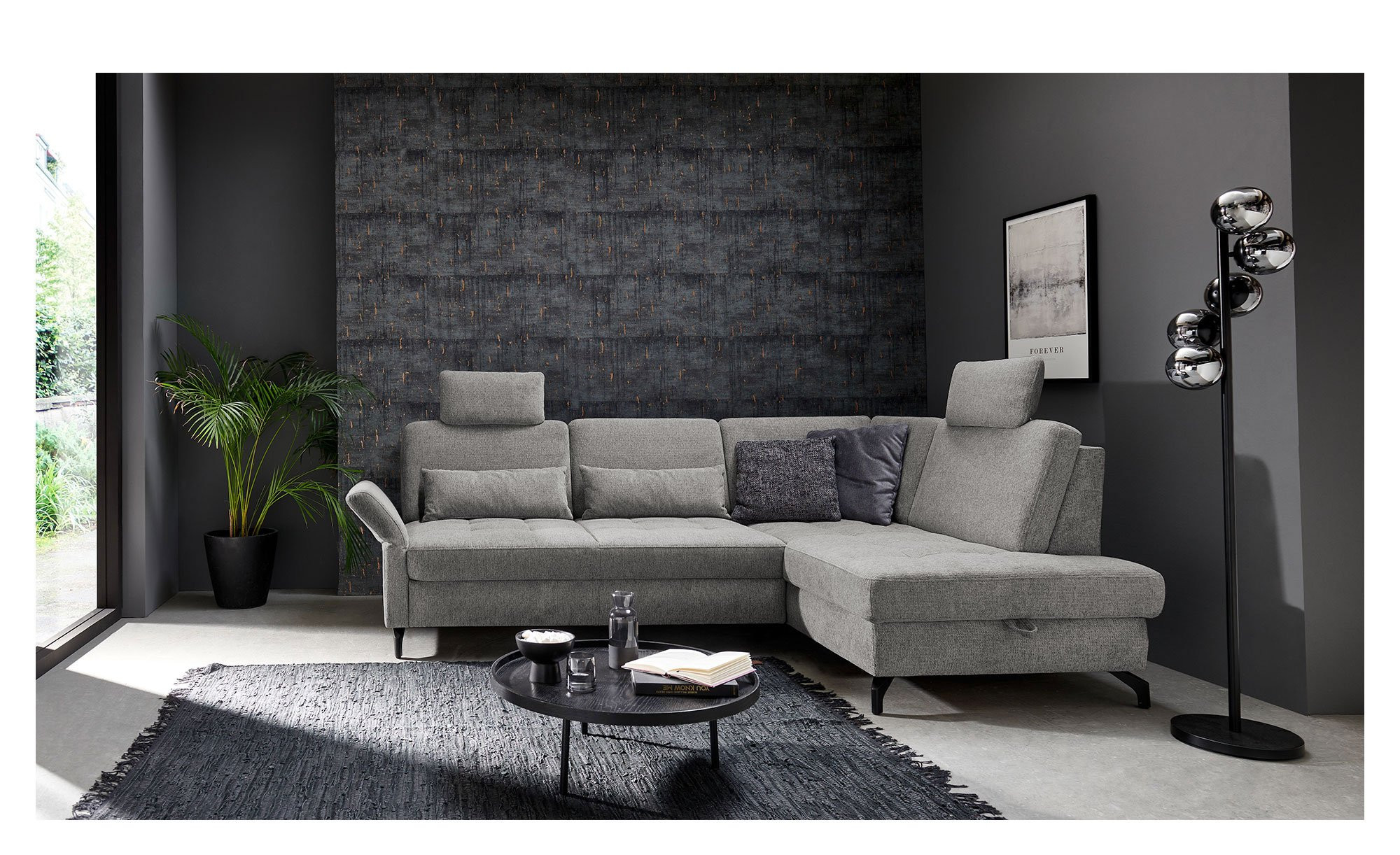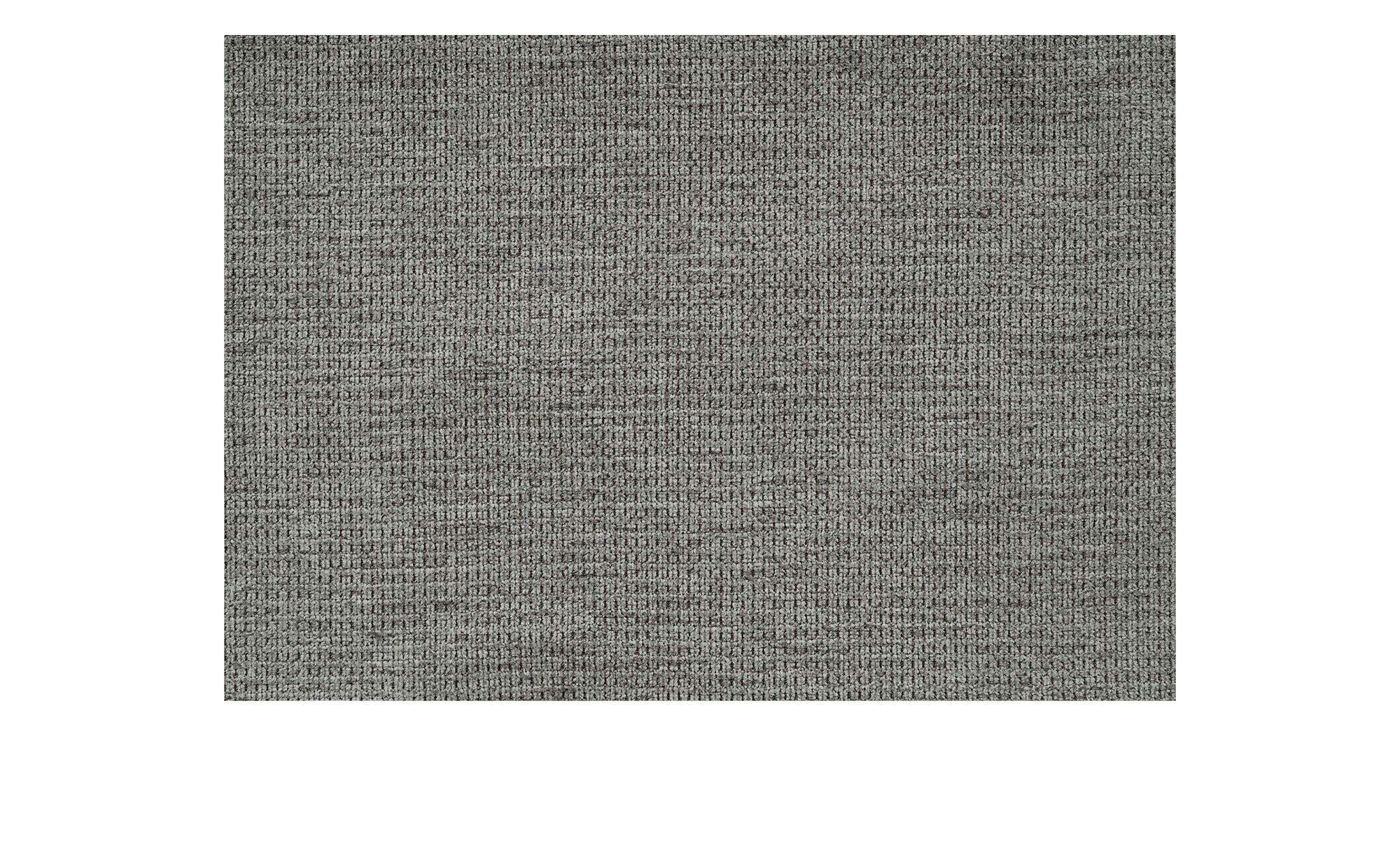 Ein grauer Stoffbezug aus 100 % PES umspannt das rechtsseitig ausgerichtete Möbelstück inklusive seines Rückens. Die Ton in Ton-Naht unterstreicht dabei das ansprechende Erscheinungsbild gemeinsam mit ca. 12 cm hohen Füßen in mattem Schwarz.