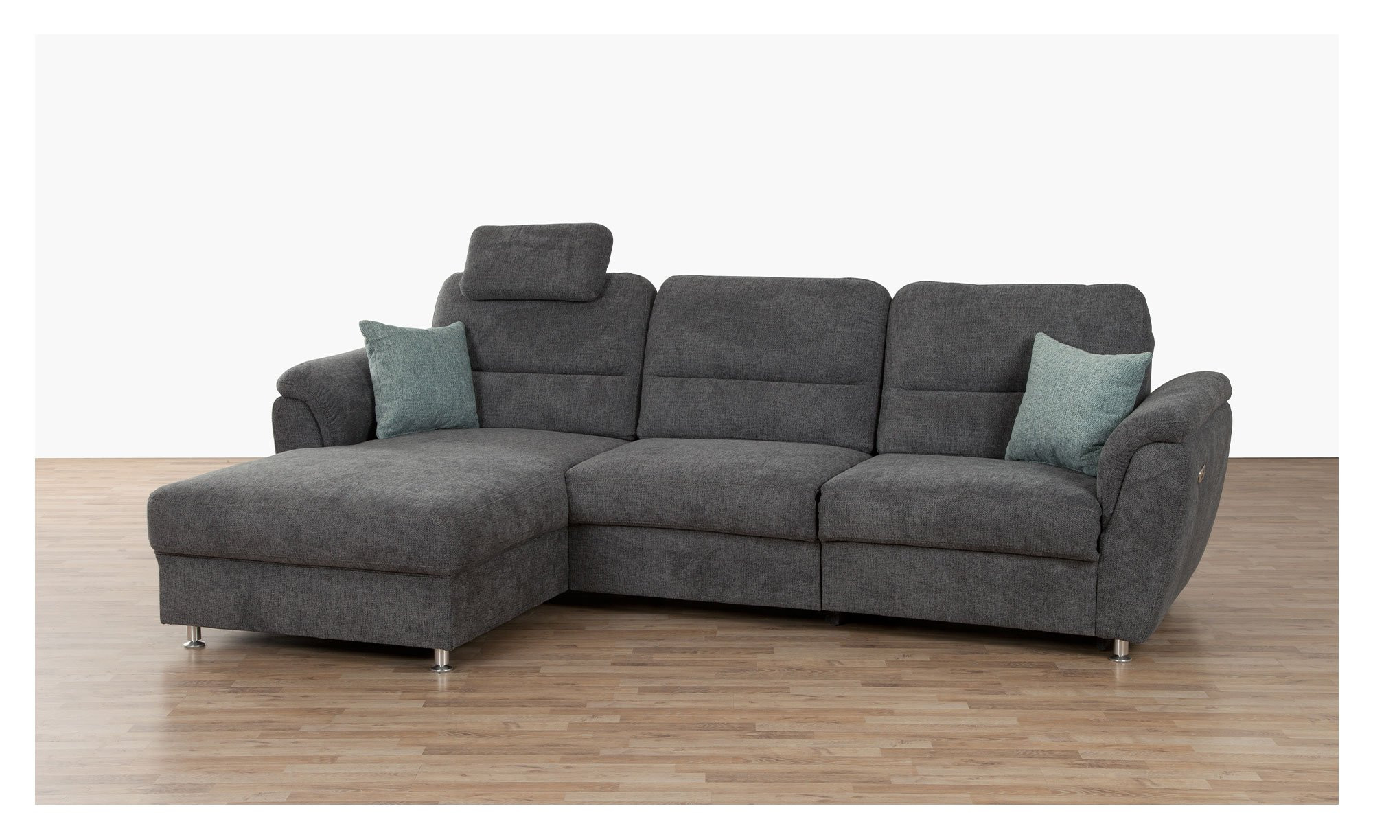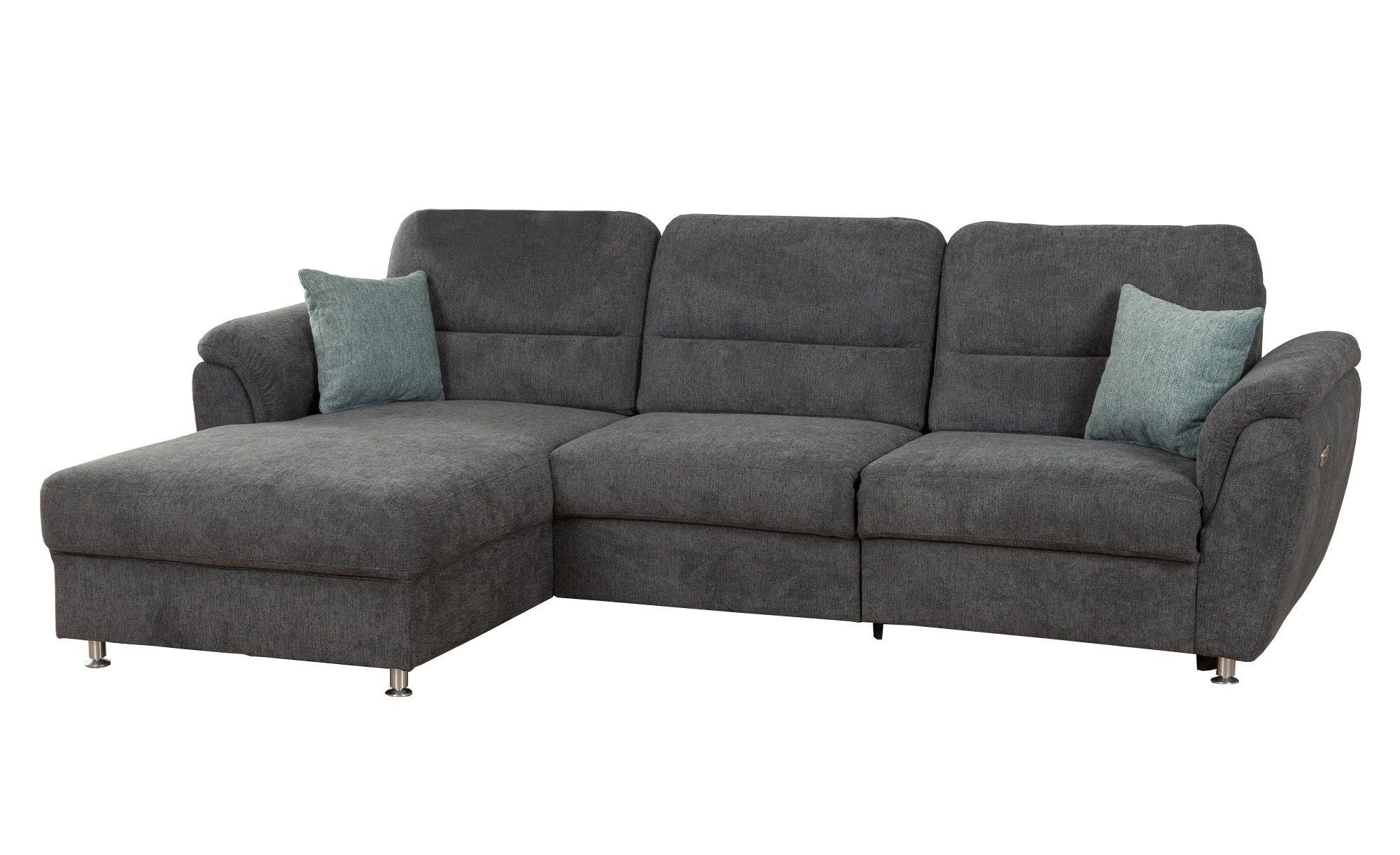 Bezogen ist das ca. 279 x 95 x 167 cm große Möbelstück mit einem grauen Stoff aus 100 % Polyester. Dank des echten Rückens bieten sich Ihnen diverse Möglichkeiten zur Platzierung. Neben stilvollen Metallfüßen in Alu-Optik sind auch zwei Zierkissen im Angebot inbegriffen. Sie sorgen mit ihrem Blau/Grün für einen Farbtupfer.