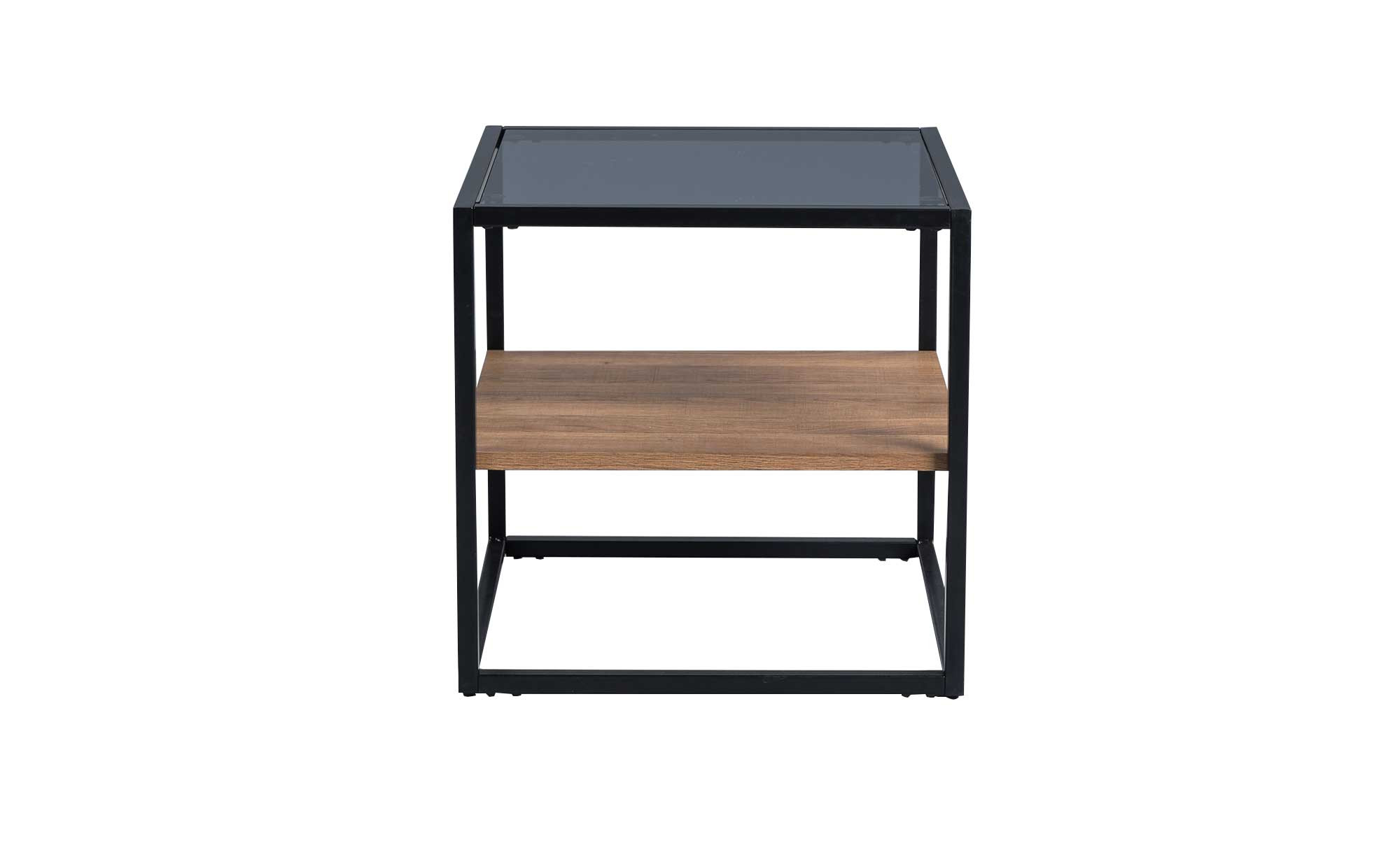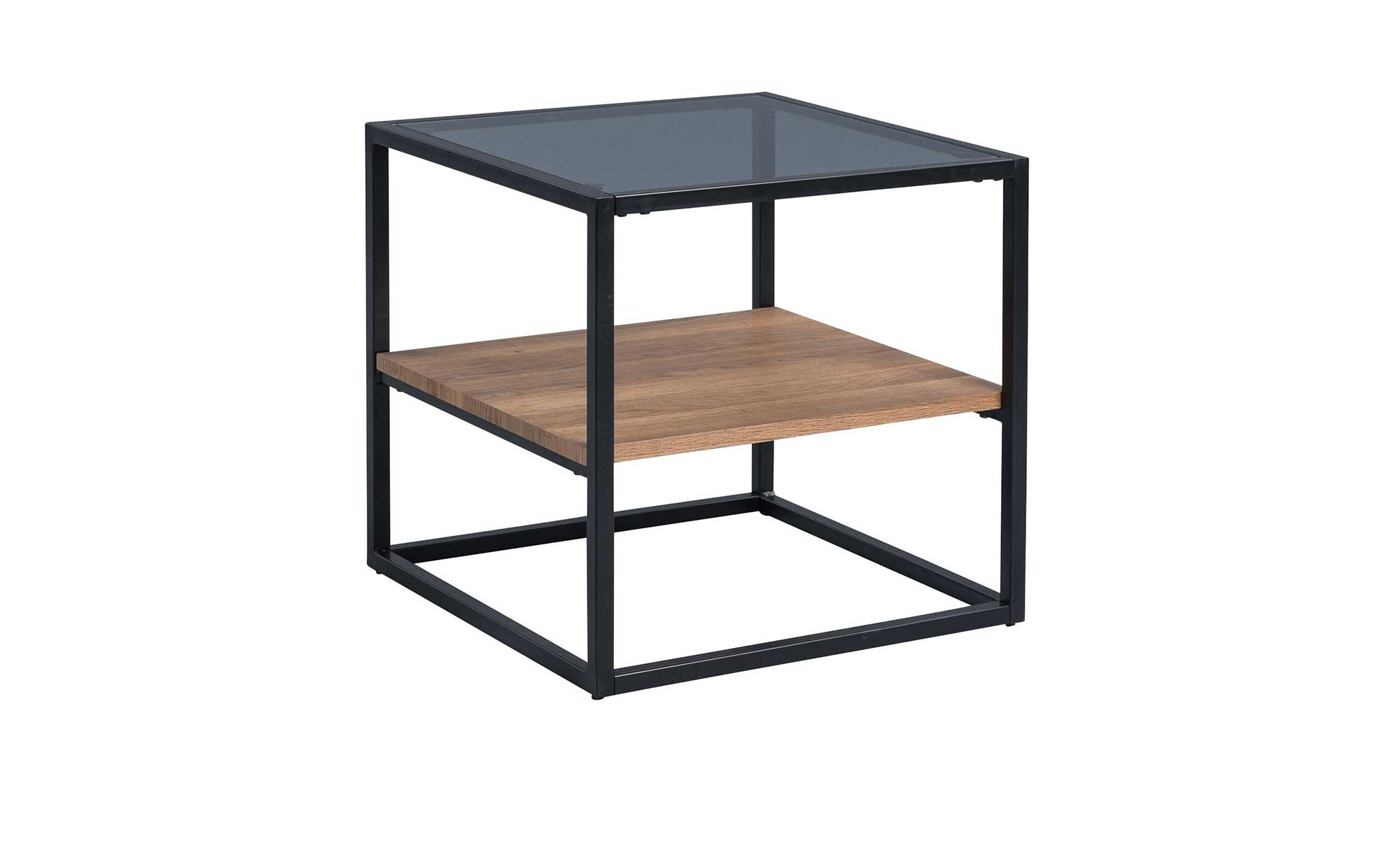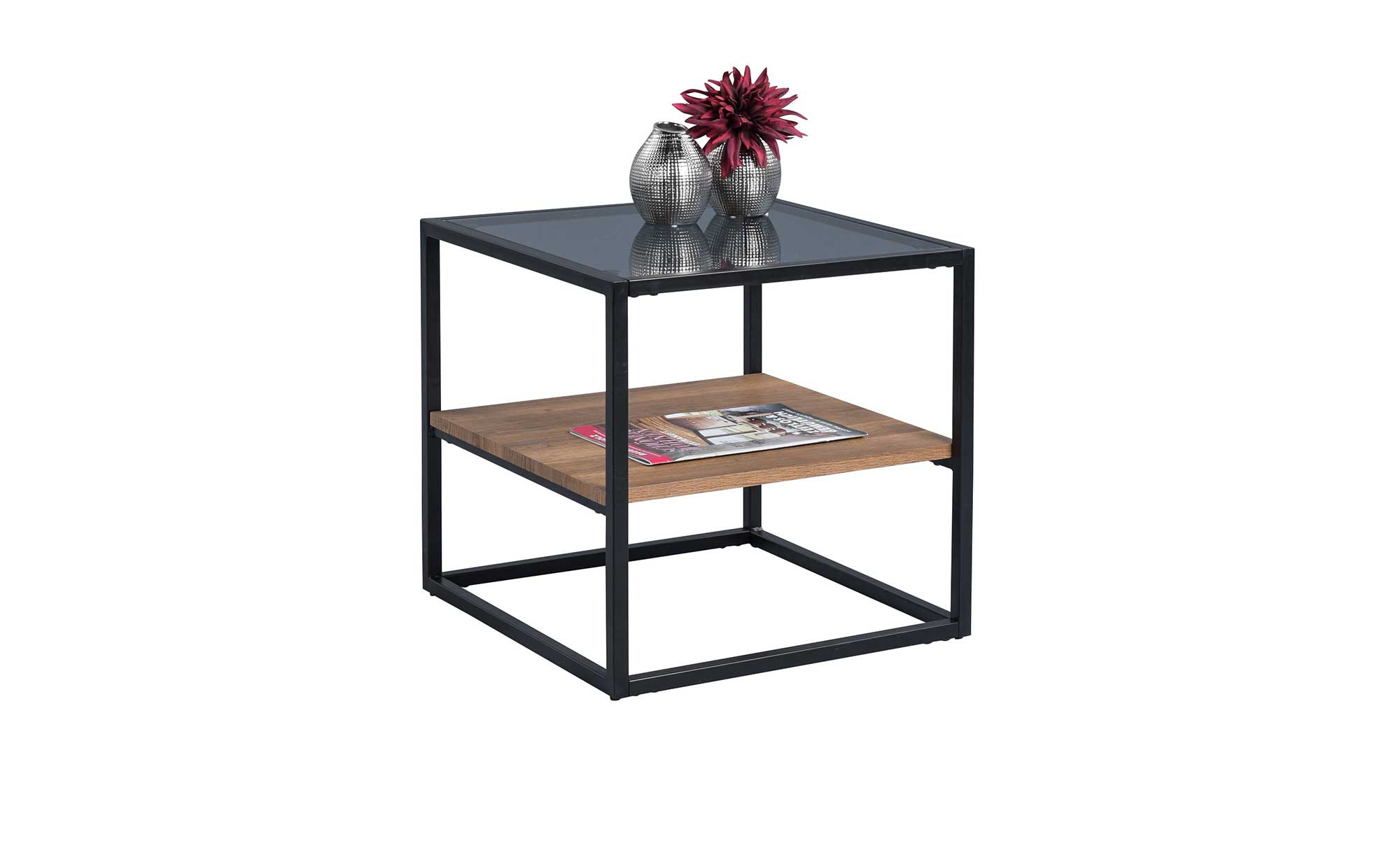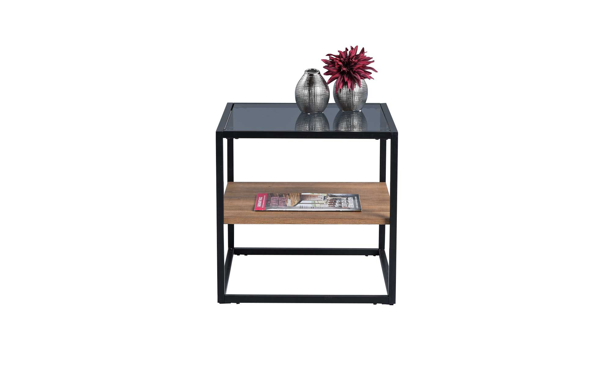 Mit seinem quadratischen Metallgestell in Schwarz sind dem ca. 50 x 50 x 50 cm großen Tisch natürlich alle Blicke sicher. Oben befindet sich eine Deckplatte aus grauem Sicherheitsglas, mittig gibt es eine weitere Platte aus Holzwerkstoff im Dekor Eiche braun. Hier können Sie diverse Utensilien ablegen, während Sie gleichzeitig etwas für eine wertige Atmosphäre im Raum tun!