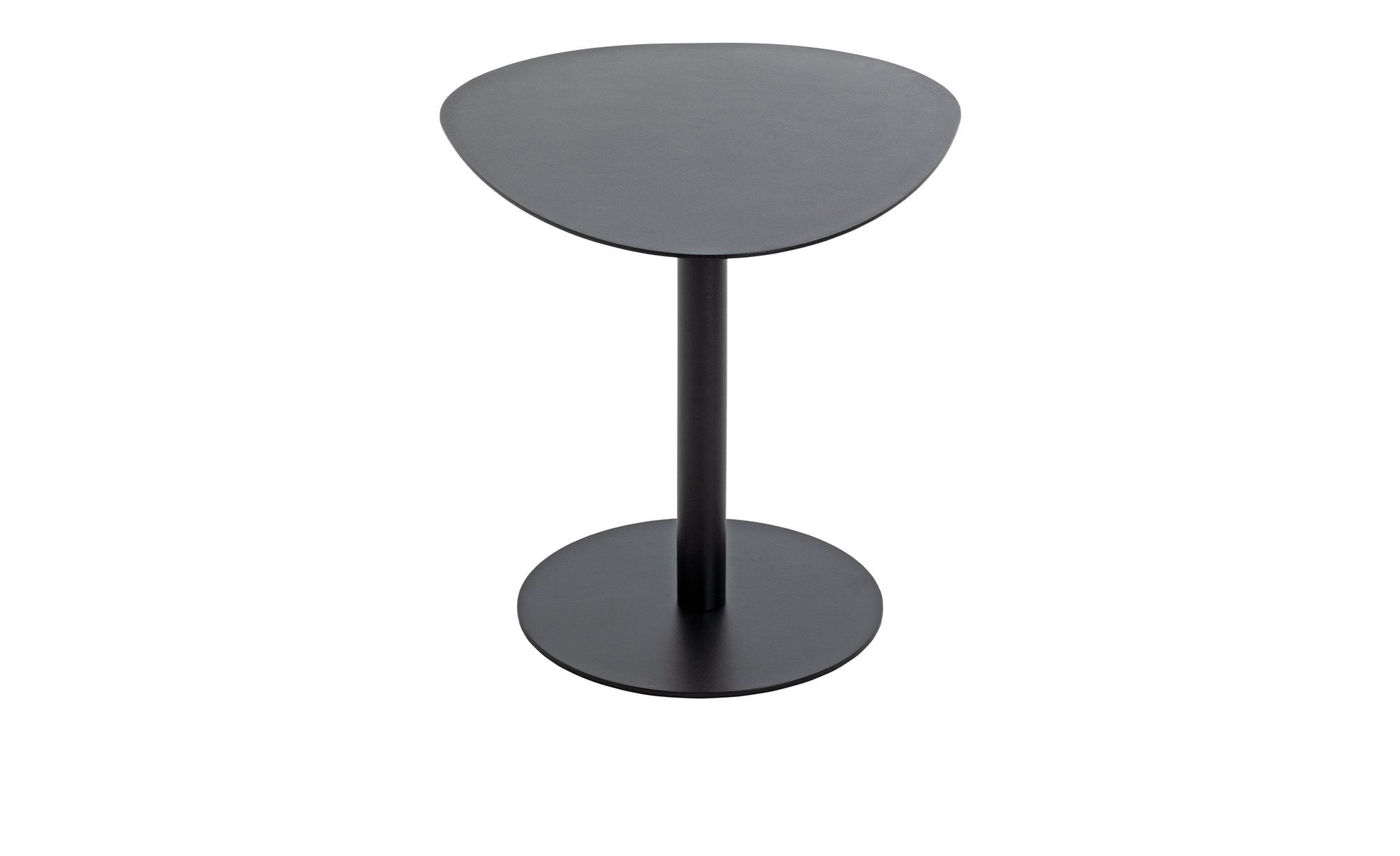 Das ca. 51 x 42 x 41 cm große Möbelstück besteht komplett aus schwarzem Metall mit Pulverbeschichtung. Seine Platte ist mit ihrer besonderen Form ein absoluter Eyecatcher.