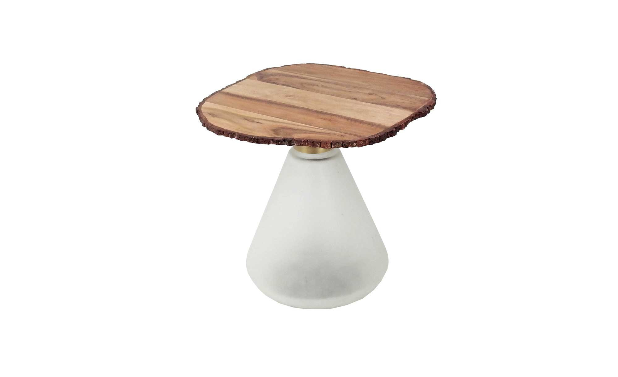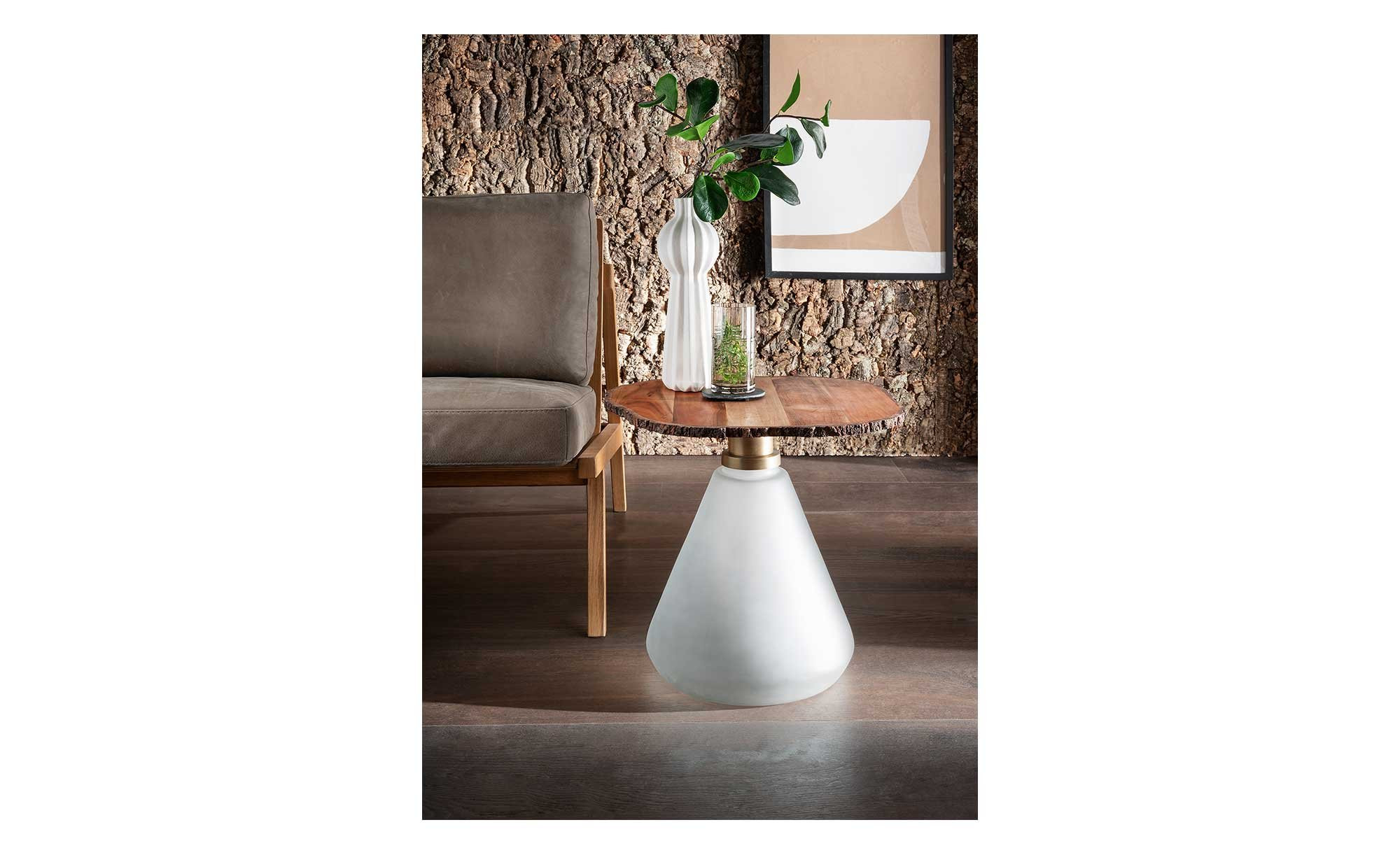 Freuen Sie sich auf eine Tischplatte aus massiver Akazie. Ihr Durchmesser beträgt ca. 46 cm. Als gelungener Kontrast fungiert das Gestell aus weißlichem Milchglas.