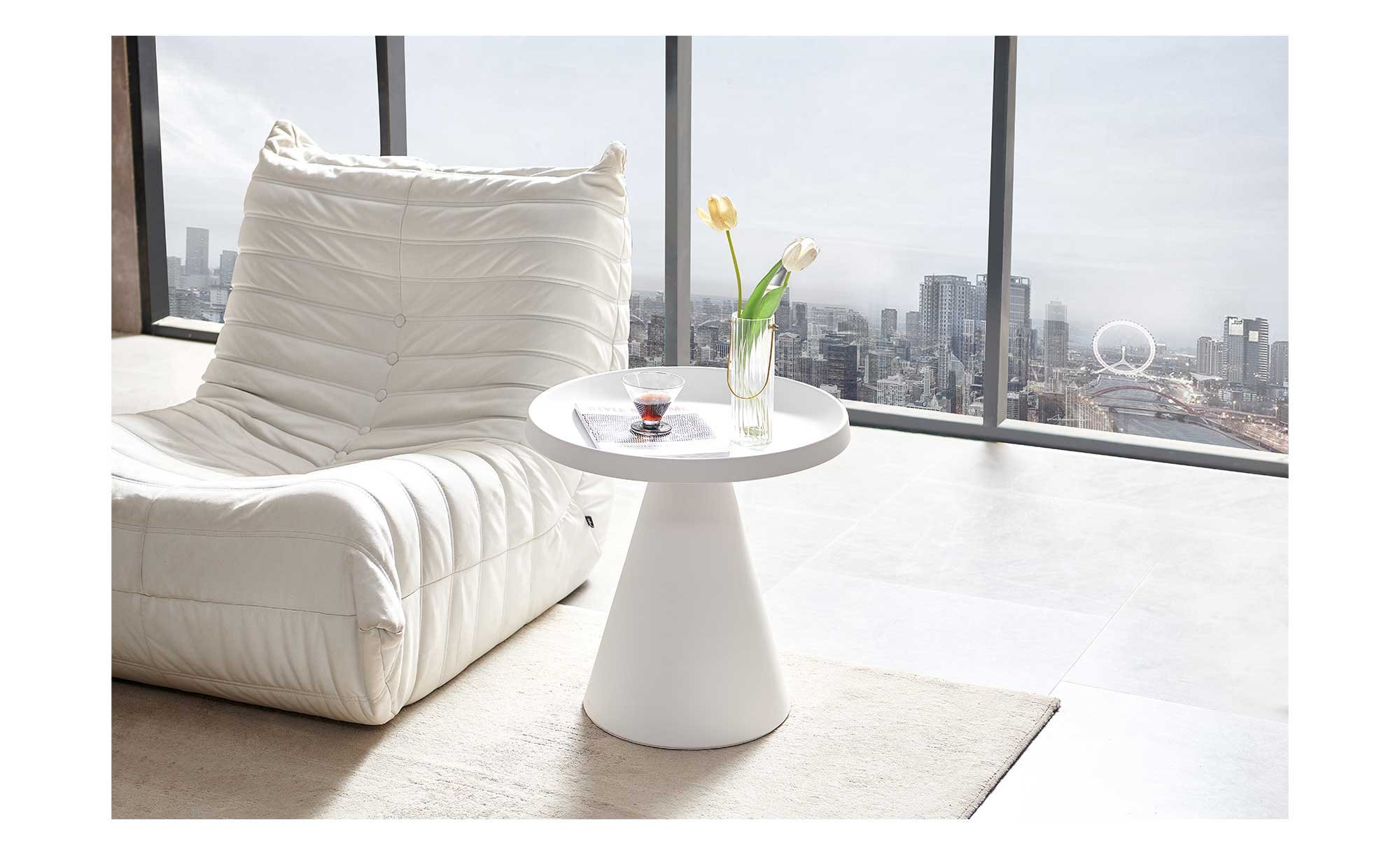 Mit seinem zeitlos-modernen Design fügt sich der ca. 50 cm hohe Artikel in beinahe jedes Raumensemble ein. Seine runde Tischplatte verfügt über einen Durchmesser von ca. 50 cm und besteht ebenso wie das Gestell aus weißem Metall mit Pulverbeschichtung.