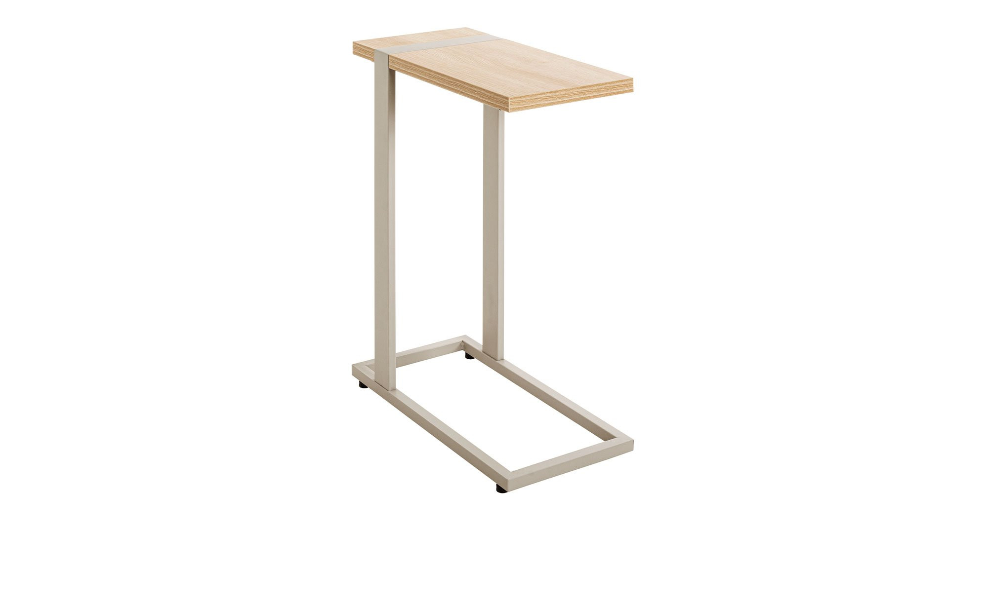 Das ca. 24 x 64 x 49 cm große Möbelstück verfügt über ein stabiles Gestell aus kaschmirgrau pulverbeschichteten Stahlrohren. Seine rechteckige Tischplatte im hellen Eiche-Dekor ist ca. 25 mm stark und bietet eine Belastbarkeit von bis zu ca. 10 kg.