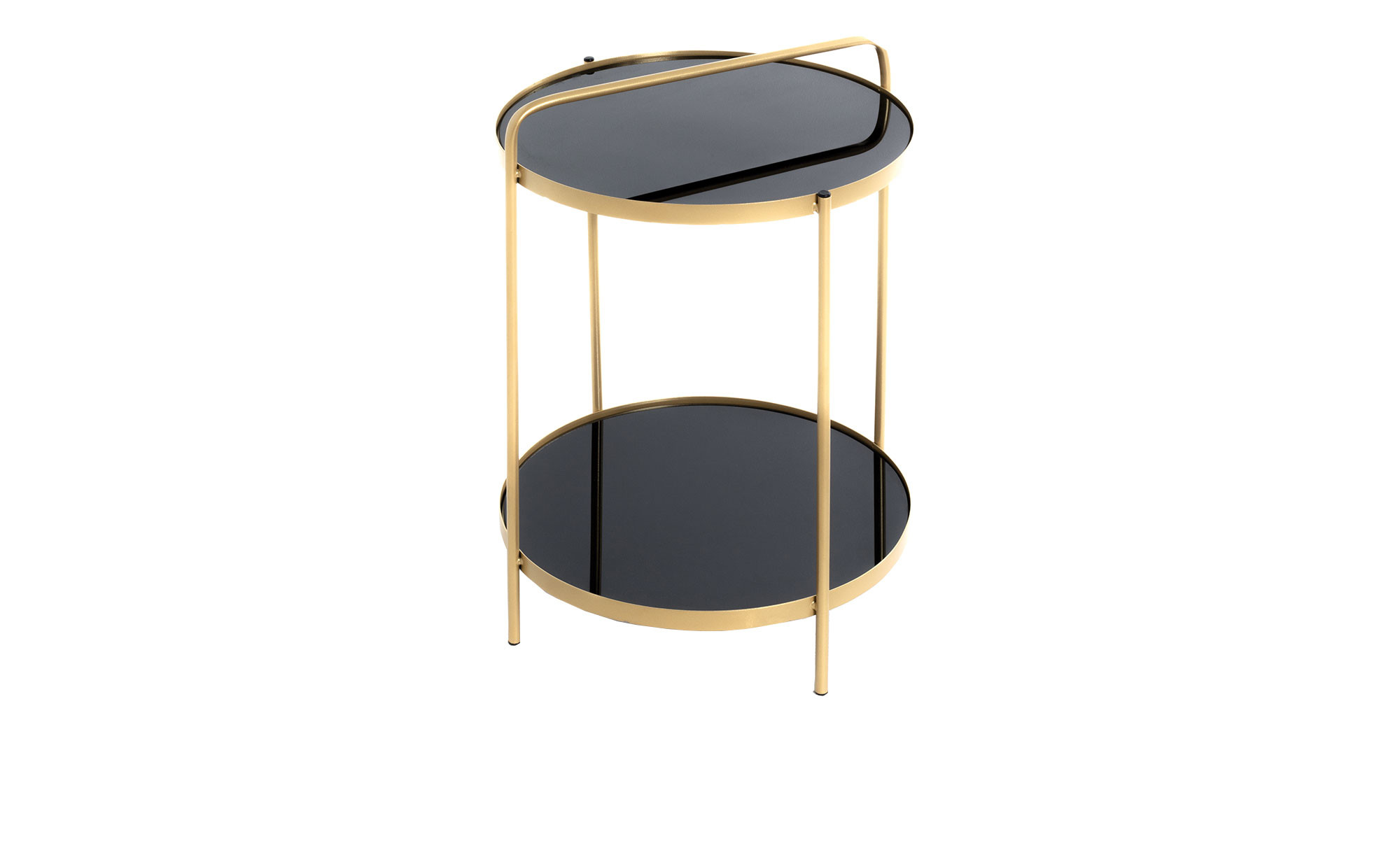 Das Gestell des ca. 51 cm hohen Tischs besteht aus golden lackiertem Metall. Es passt perfekt zu den beiden runden Ablageplatten aus schwarz lackiertem Sicherheitsglas. Diese haben einen Durchmesser von ca. 38 cm.
