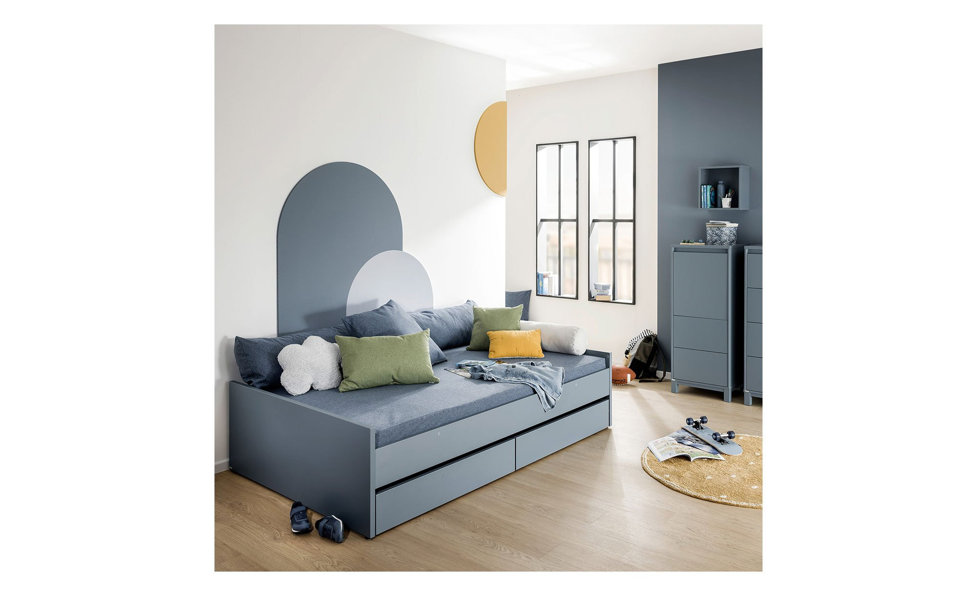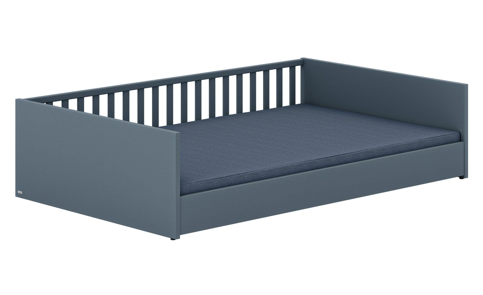 Der ca. 128 x 51 x 206 cm große Artikel besteht aus mattblauem Holzwerkstoff und ist vorne wie hinten mit Design-Gitterseiten ausgestattet. Sie sichern die Liegefläche mit Maßen von ca. 120 x 200 cm ab.