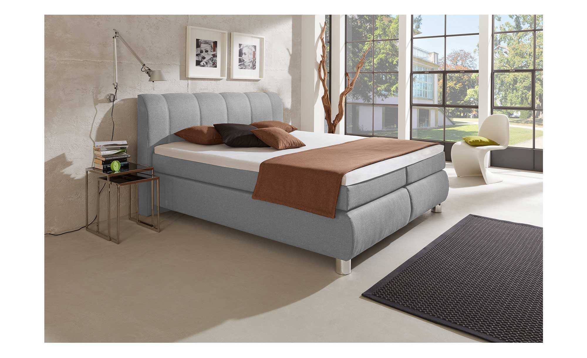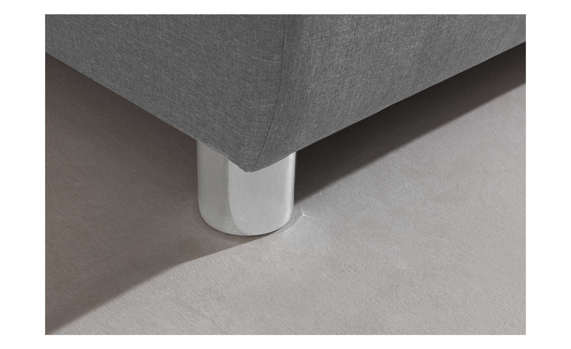 Der steingraue Wollvelours-Gewebe-Bezug besteht aus 100 % Polyester. Dazu passen nicht nur die chromfarbigen Kunststofffüße, auch das Kopfteil mit senkrechter Doppelnahtsteppung wirkt dank der Farbgebung zugleich bequem und stylish.