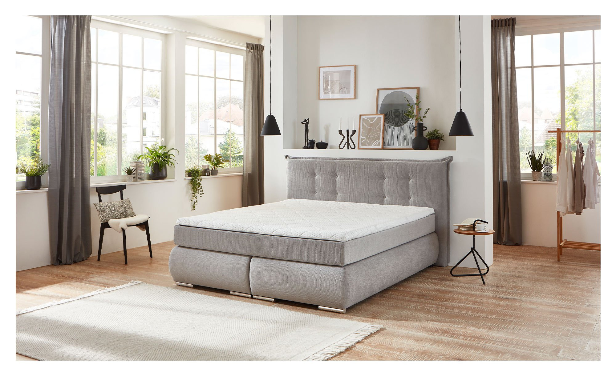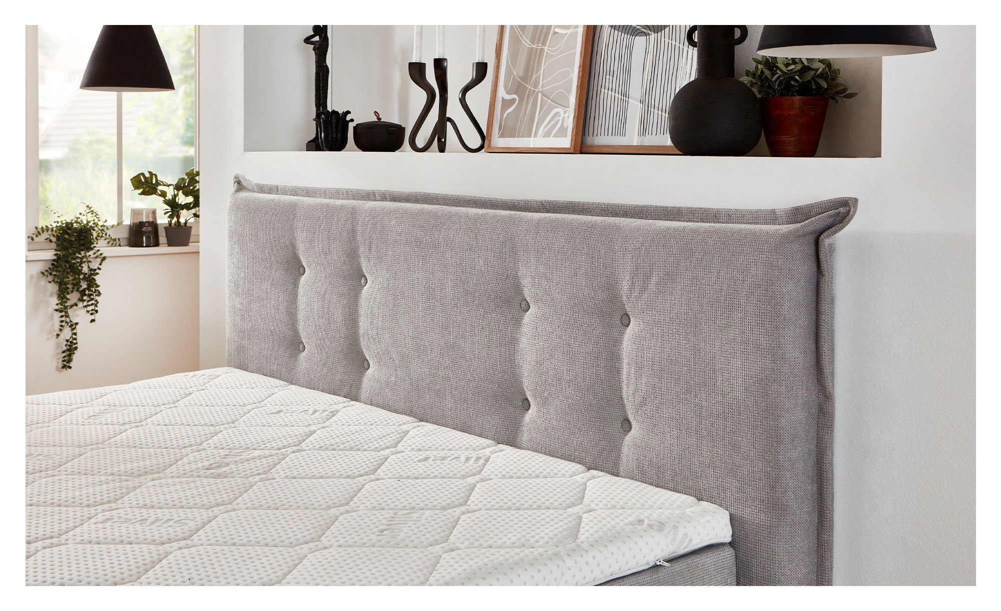 Als Basis dienen zwei Boxen mit Bonell-Federung, auf denen die ca. 180 x 200 cm große Liegefläche liegt. Die Taschenfederkern-Matratze ist beidseitig mit PU-Schaumstoff gepolstert, verfügt über sieben ergonomische Zonen und kann wahlweise mit dem Härtegrad H2 oder H3 genutzt werden. Ein direkt integrierter Komfortschaum-Topper sorgt für zusätzlichen Liegekomfort und bringt die Gesamthöhe auf ca. 25 cm, sodass er sich optimal an Ihren Körper anpasst und erholsame Nächte garantiert.