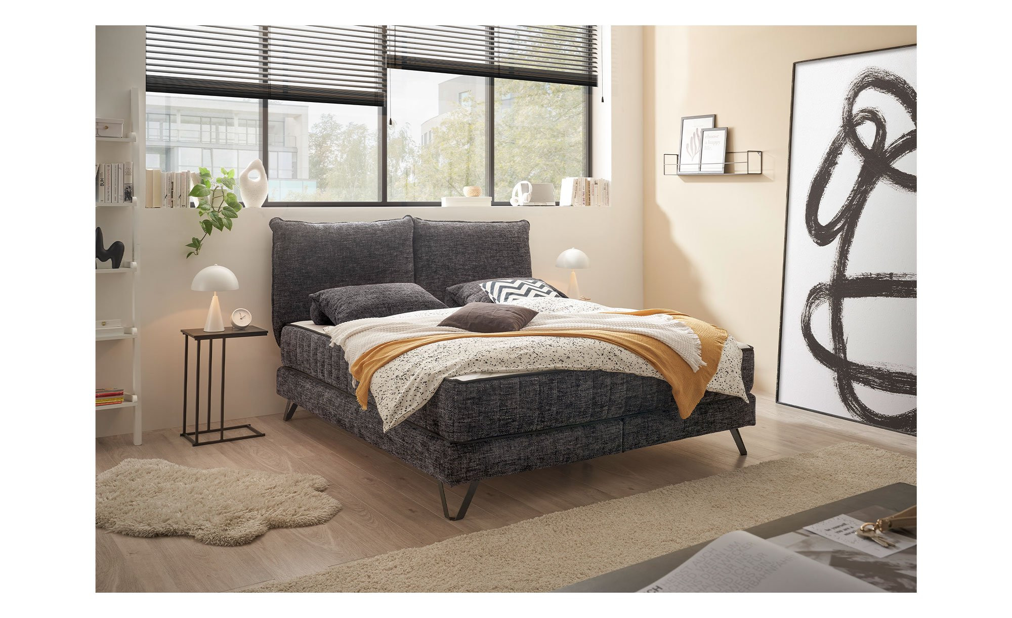 Das ca. 202 x 118 x 212 cm große Bett ist mit einem hochwertigen Webstoff aus 100 % Polyester in Anthrazit bezogen und überzeugt mit einem markanten, zweigeteilten Kopfteil in Kissenform. Schwarze Metallfüße setzen auf ca. 13 cm Höhe moderne Akzente und verleihen dem Design die nötige Leichtigkeit.