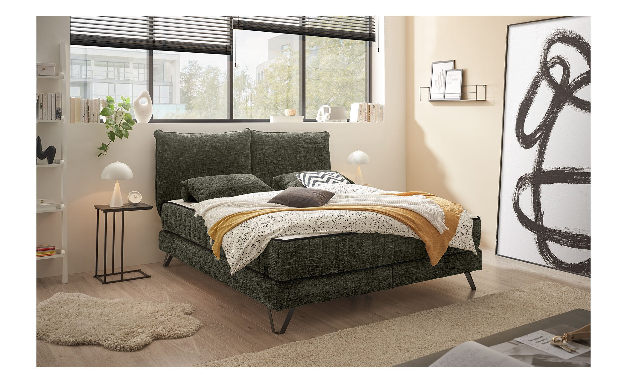 Bezogen ist der ca. 202 x 118 x 212 cm große Artikel mit einem dunkelgrünen Webstoff aus 100 % Polyester. Besonders auffällig ist das zweigeteilte Kopfteil in Kissenform, das für eine Extraportion Behaglichkeit sorgt. Die schwarzen Metallfüße setzen mit ca. 13 cm Höhe einen stilvollen Kontrast.