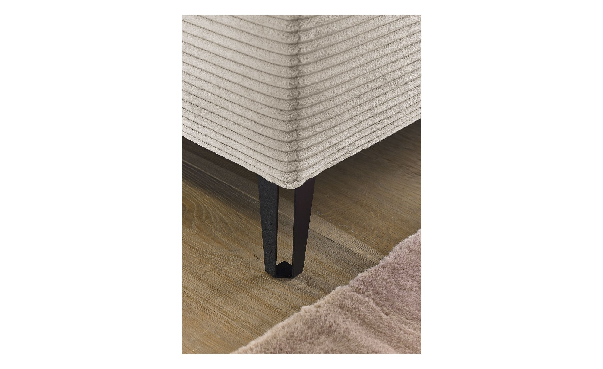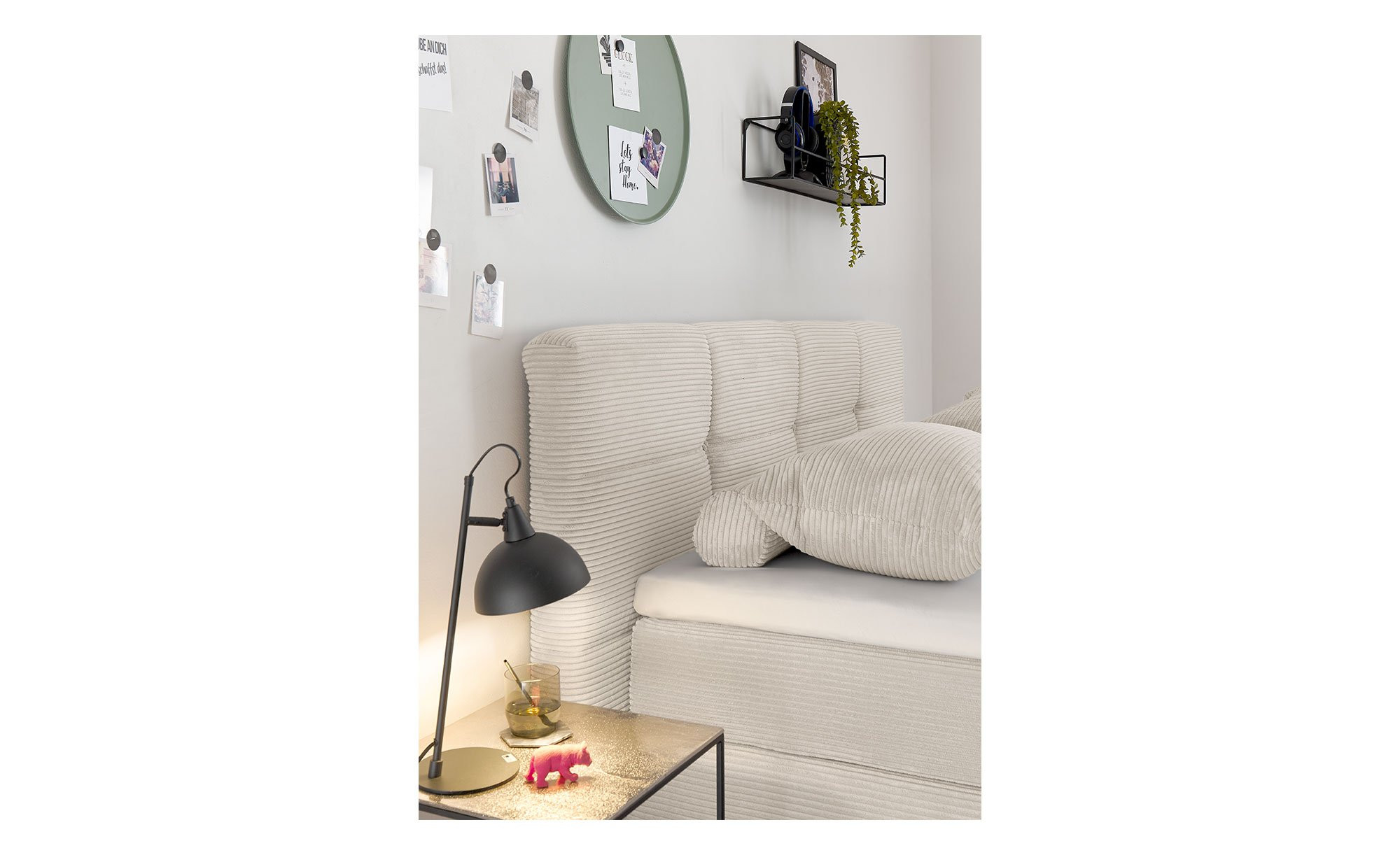 Das ca. 204 x 116 x 218 cm große Bett begeistert durch einen Mikrofaser-Bezug in Beige, der dem Raum eine angenehme Atmosphäre verleiht. Das Kopfteil ist mit komfortablen Kassettenfedern ausgestattet, während die ca. 12 cm hohen schwarzen Metallfüße für einen modernen Look sorgen.