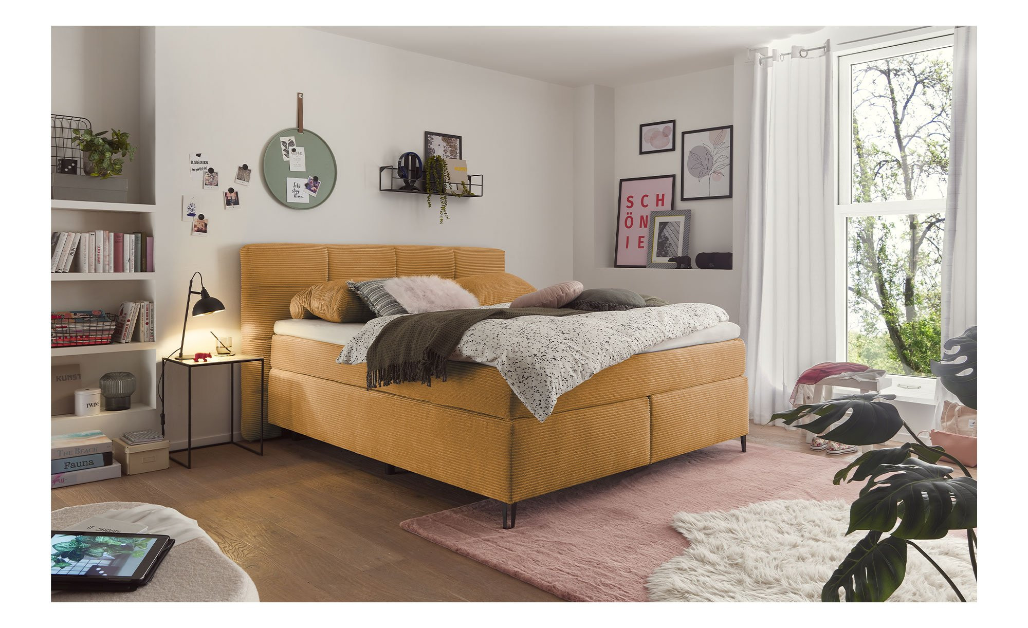 Der ca. 204 x 116 x 218 cm große Artikel ist mit einem gelben Mikrofaser-Bezug versehen, der für eine freundliche, einladende Atmosphäre sorgt. Das Kopfteil mit Kassettenfedern sowie die ca. 12 cm hohen Metallfüße in Schwarz fügen sich harmonisch ins Gesamtbild ein.
