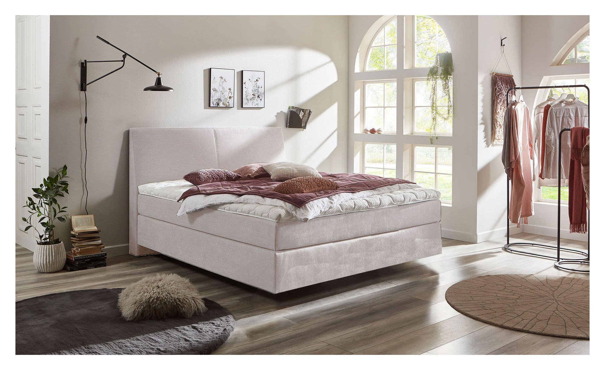 Das Boxspringbett vito Asetto in der sanften Farbe Lunar Rock besticht durch seine elegante Schwebeoptik, die durch die versetzten Füße erzeugt wird.