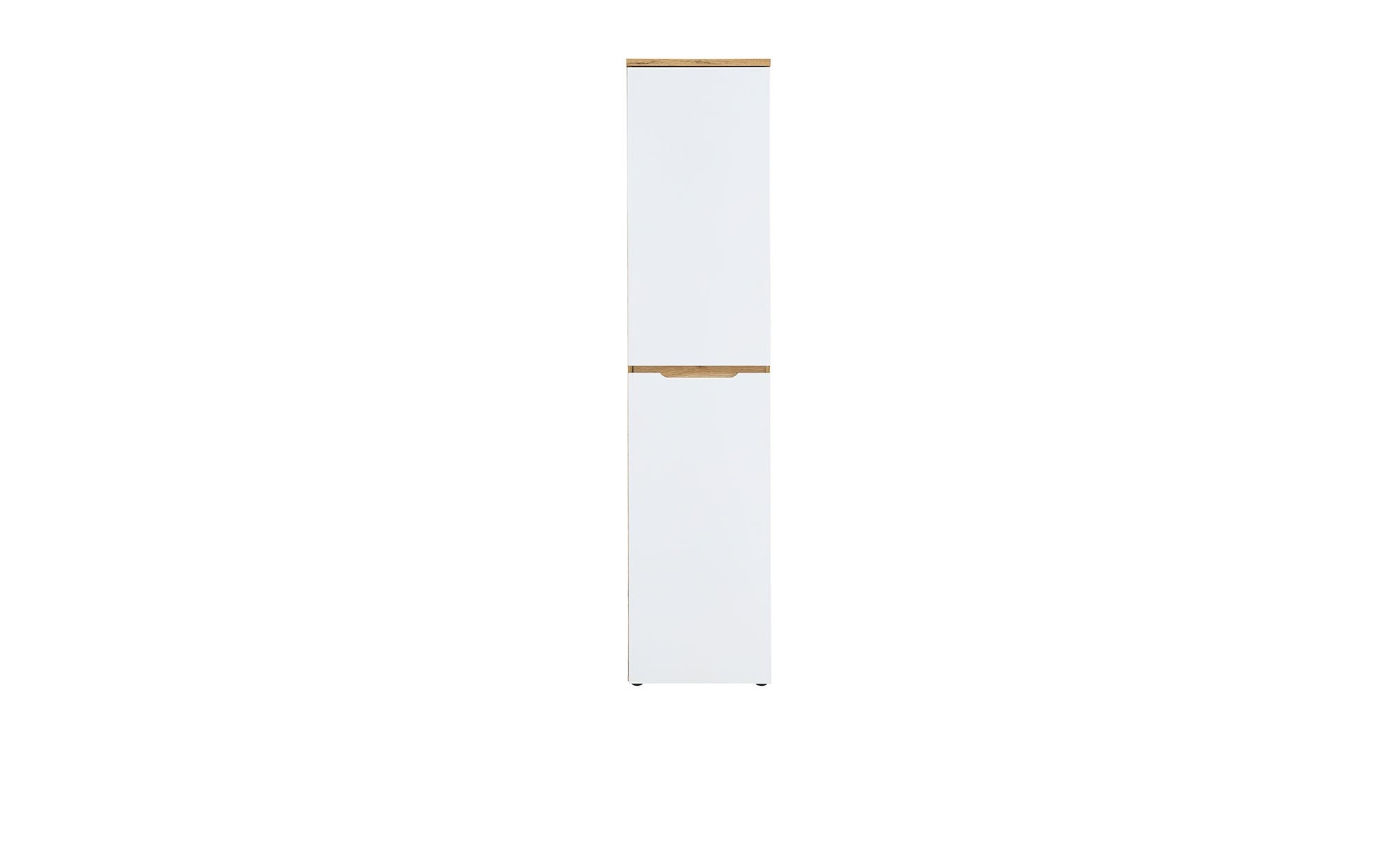 Der Schrank misst ca. 45 x 197 x 38 cm und bietet einen Korpus aus Holzwerkstoff in einer natürlichen Mauvella Oak Nachbildung. Dieser Stil findet sich ebenso im Inneren des Artikels sowie an seiner Rückwand wieder. Die MDF-Fronten sind in supermattem Weiß gehalten und verfügen über Griffausfräsungen. Bodenschonende Kunststoffgleiter sorgen für einen stabilen Stand.