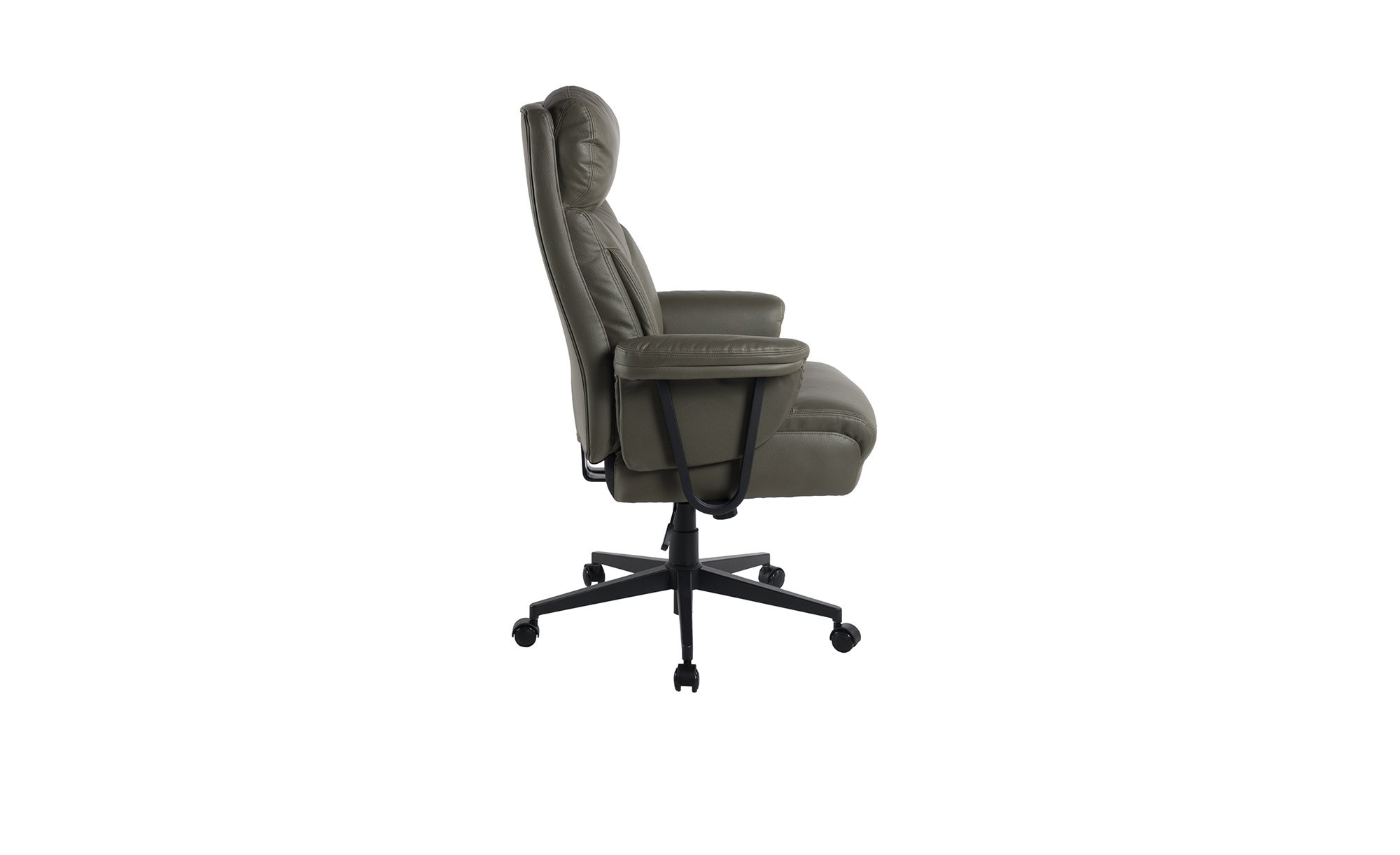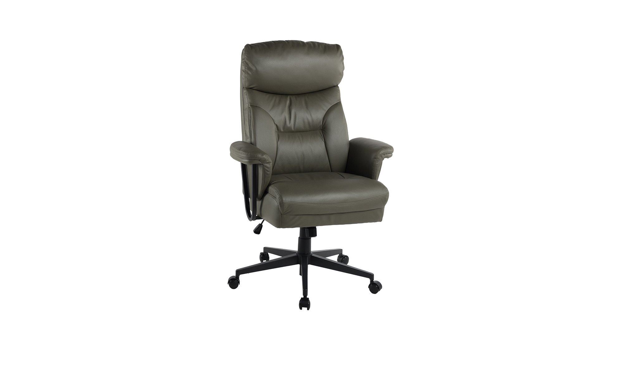 Der ca. 77 x (116-) 124 x 77 cm große Stuhl verfügt über ein schwarzes Metallgestell mit gepolsterten Armlehnen und einem besonders belastbaren Fußkreuz. An diesem befinden sich gebremste Sicherheitsdoppelrollen, die sich für feste Bodenbeläge eignen. Der Sitz ist mit einem olivegrünen Bezug aus Mikrofaser in Leder-Optik versehen. Dieser besteht aus 100 % Polyester.
