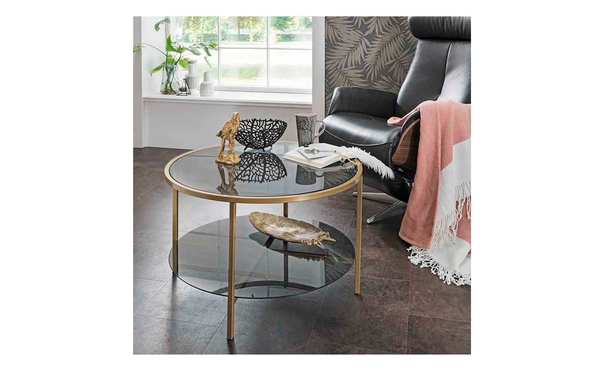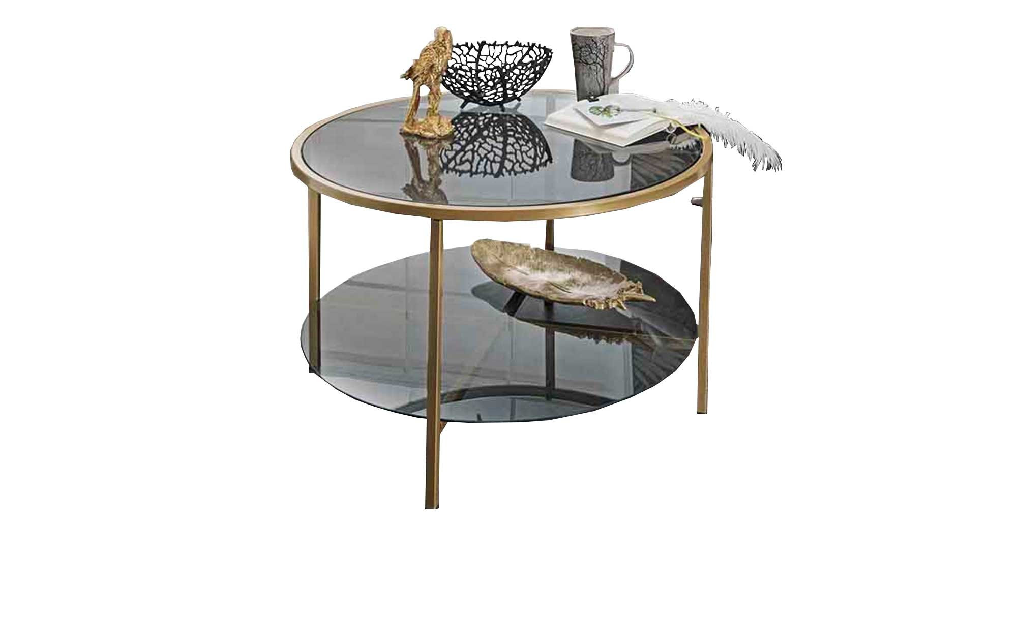 Der runde Tisch ist ca. 75 x 45 x 75 cm groß und verfügt als Basis über ein goldenes Metallgestell. Sowohl die Tischplatte als auch die weiter unten angebrachte Ablagefläche besteht aus Grauglas. Freuen Sie sich auf ein stimmiges, edles Gesamtbild!