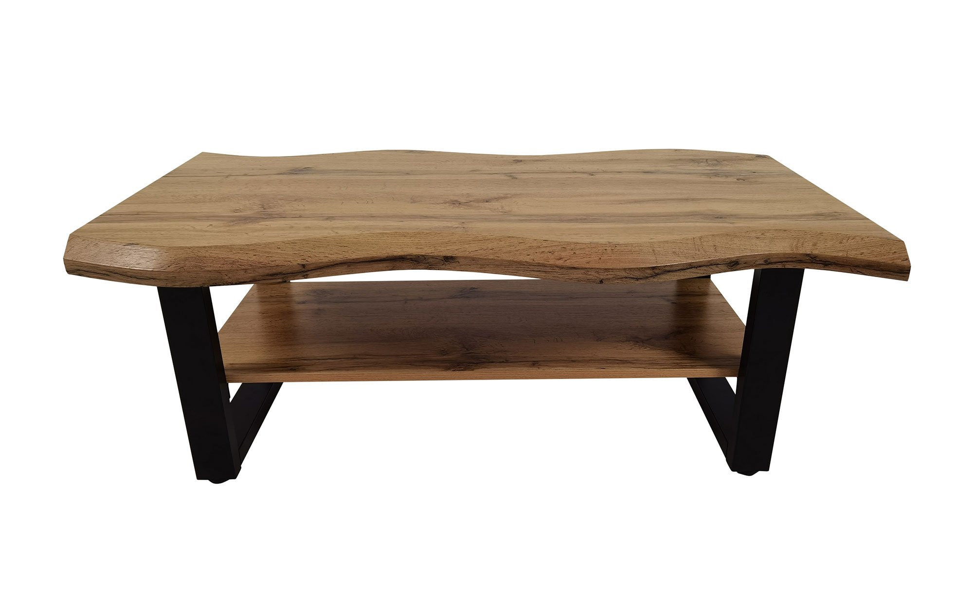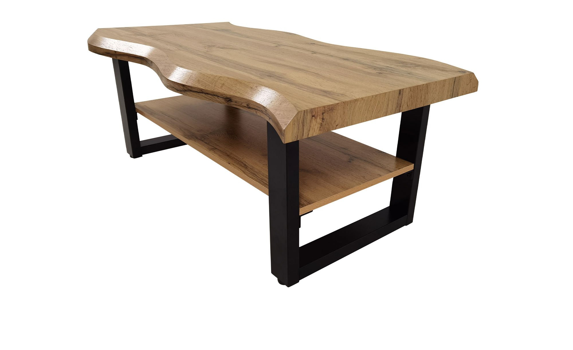 Mit seiner rechteckigen Tischplatte in Wildeiche-Baumkanten-Optik zieht der ca. 110 x 42 x 60 cm große Tisch alle Blicke auf sich. Die Platte besteht aus Holzwerkstoff mit schützender Melaminbeschichtung. Sie wird von einem stabilen U-Gestell aus schwarzem Metall mit Pulverbeschichtung getragen.