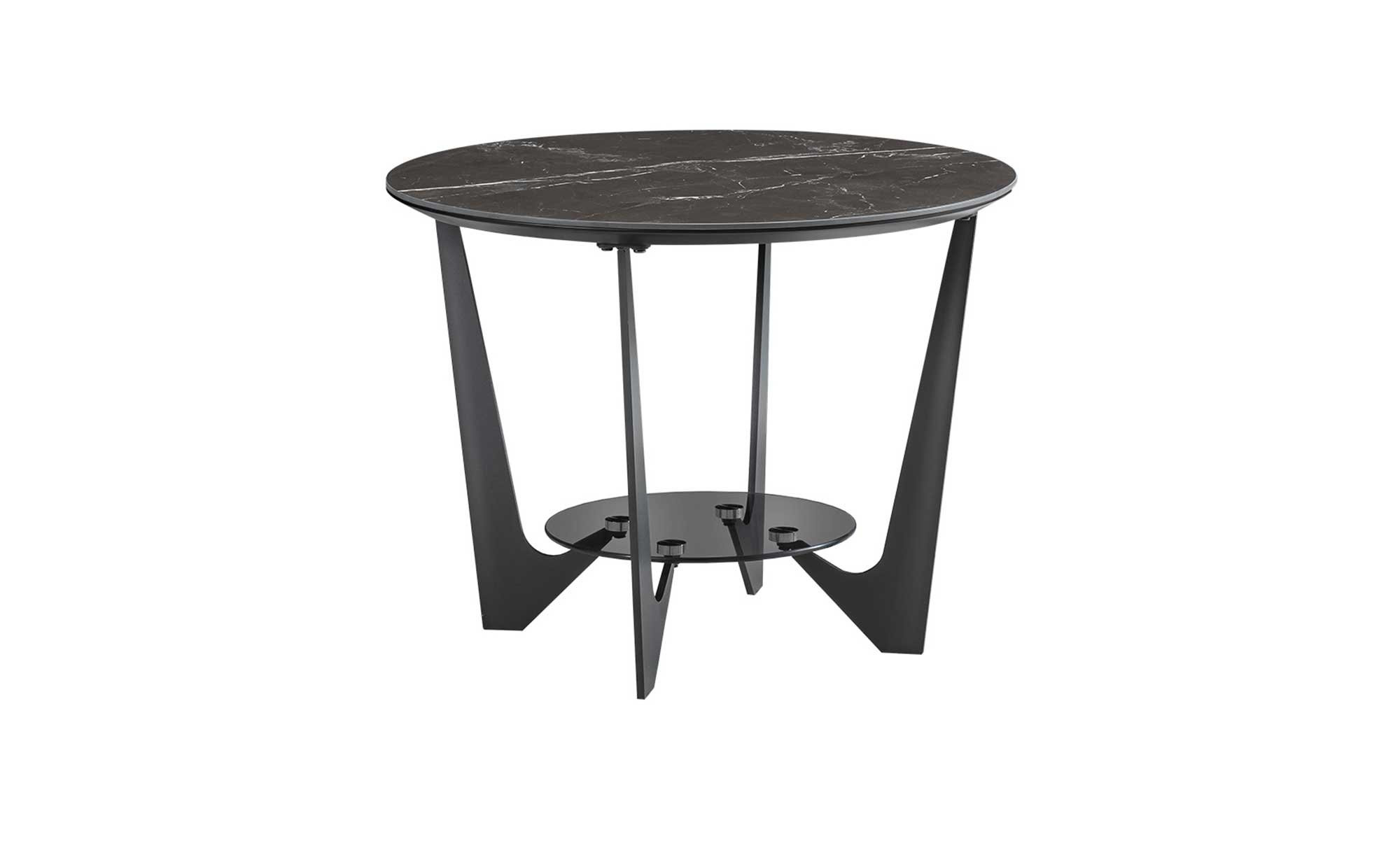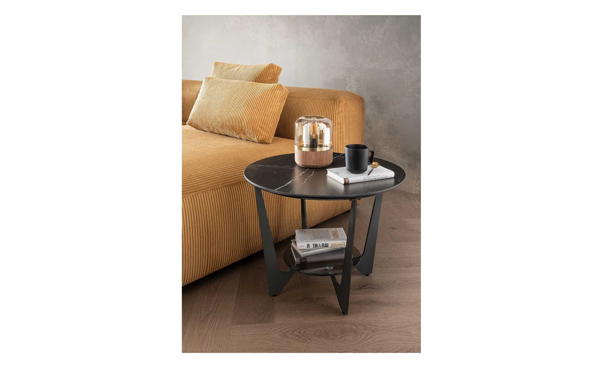 Der Artikel ist mit einer runden Platte aus ca. 0,5 cm starker Keramik in einem matten Schwarz ausgestattet. Ihre Marmorierung zieht alle Blicke auf sich und sorgt für eine wertige Atmosphäre. Während ihr Durchmesser ca. 60 cm beträgt, ist die weiter unten angebrachte Ablageplatte aus ca. 0,5 cm Rauchglas etwas kleiner.