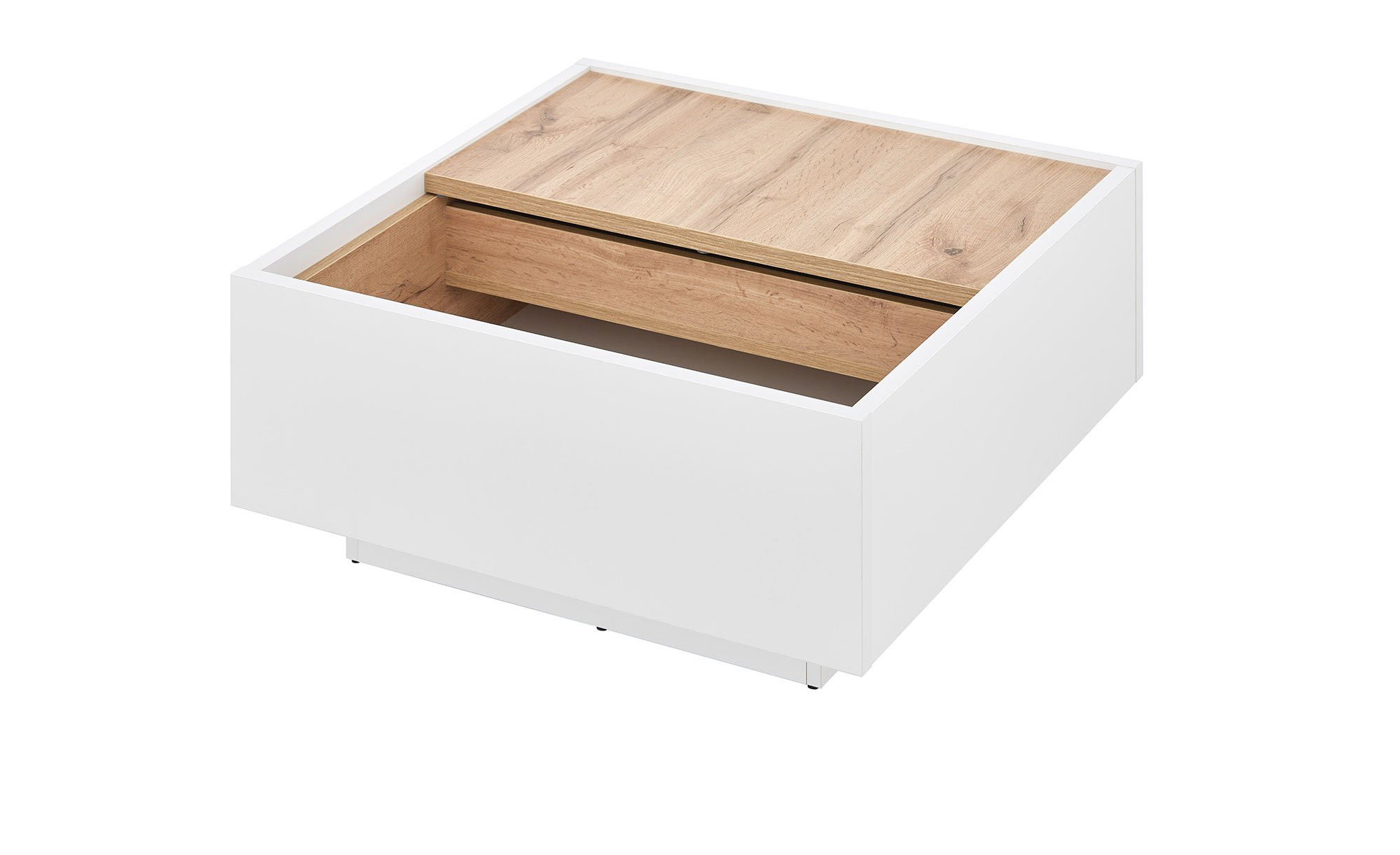 Sowohl das Gestell als auch die Platten des ca. 75 x 34 x 75 cm großen Möbelstücks bestehen aus Holzwerkstoff. Während der Korpus allerdings ganz in Weiß gehalten ist, findet sich an der Tischplatte und am Ablageboden ein natürliches Eiche Wotan-Dekor. Eine widerstandsfähige Melaminharzbeschichtung beugt hier zuverlässig Verschleiß vor. Als Füße fungieren bodenschonende Kunststoffgleiter.