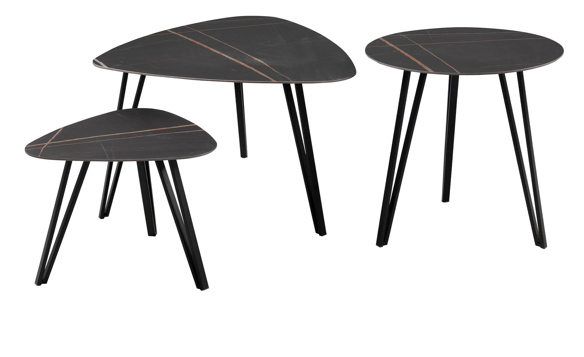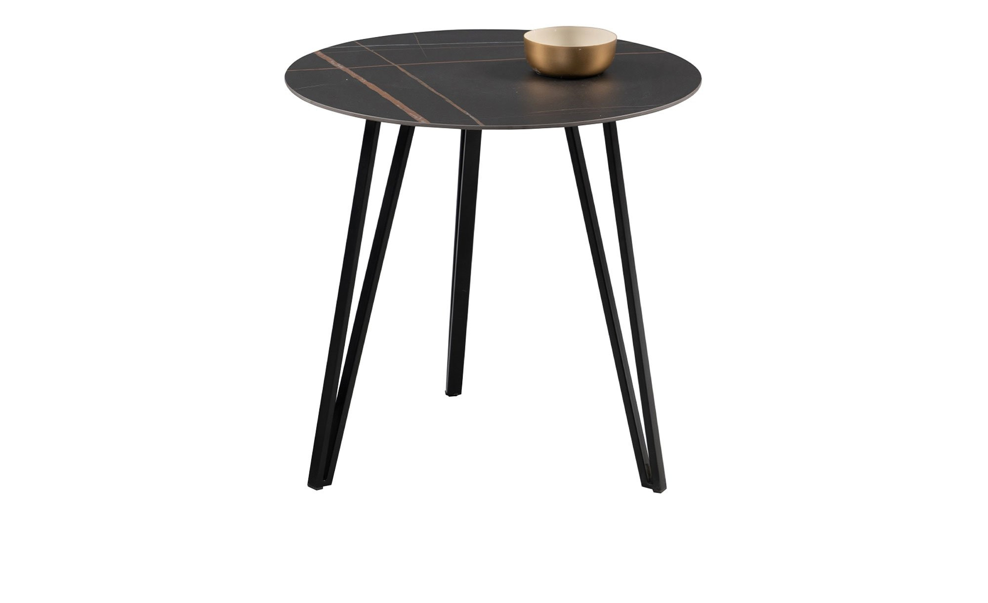 Der ca. 50 cm hohe Tisch ist rund; auch sein Durchmesser beträgt ca. 50 cm. Freuen Sie sich auf ein hochwertiges Gestell mit drei Füßen aus schwarzem Metall! Dieses trägt die außergewöhnliche Platte, die aus gesintertem Stein in Schwarz / Anthrazit gefertigt wurde.