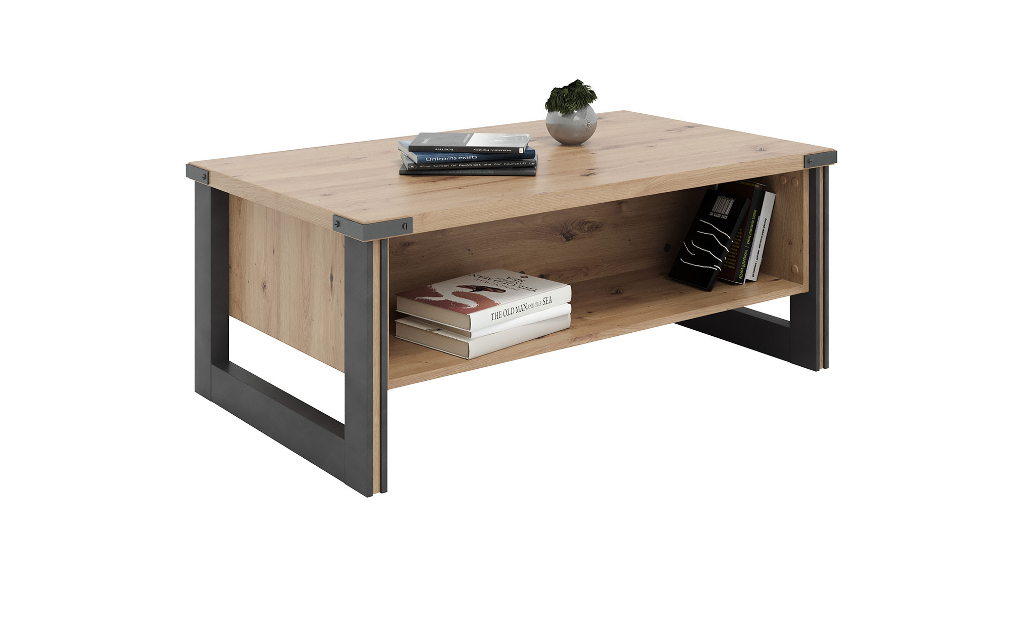 Sie möchten Ihrem Wohnzimmer eine markante Note verleihen? Dann kommt unser Couchtisch Malta gerade recht, schließlich entspricht der 110 x 90 cm große Tisch genau dem lässigen Industrial Style. Die Kombination aus Artisan Eiche Nachbildung und einem Kufengestell in Matera Nachbildung ergeben ein stilvolles Gesamtbild.