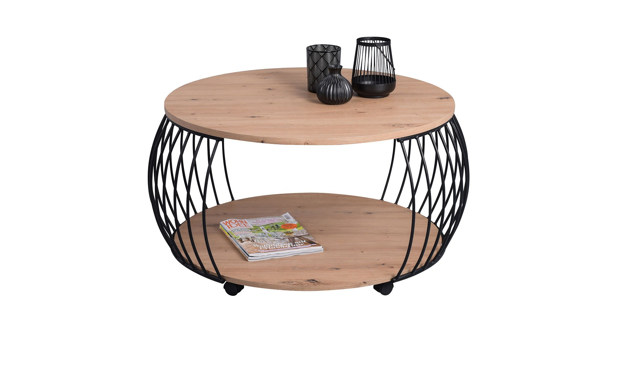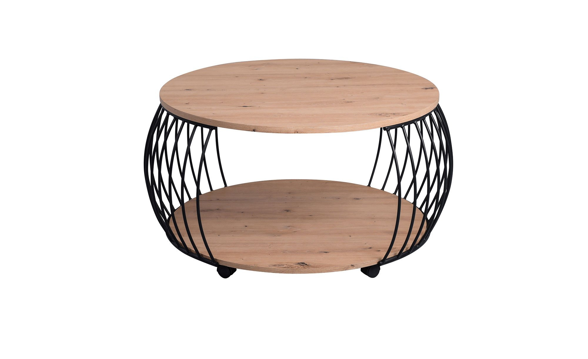 Der ca. 47 cm hohe Tisch verfügt über zwei Platten mit einem Durchmesser von ca. 80 cm. Sie bestehen aus MDF und begeistern mit ihrem natürlichen Artisan Eiche Dekor. Dazwischen befindet sich ein stilvolles Metallgestell in Schwarz. Es gewährleistet die nötige Stabilität und springt durch sein Erscheinungsbild ebenfalls unmittelbar ins Auge.