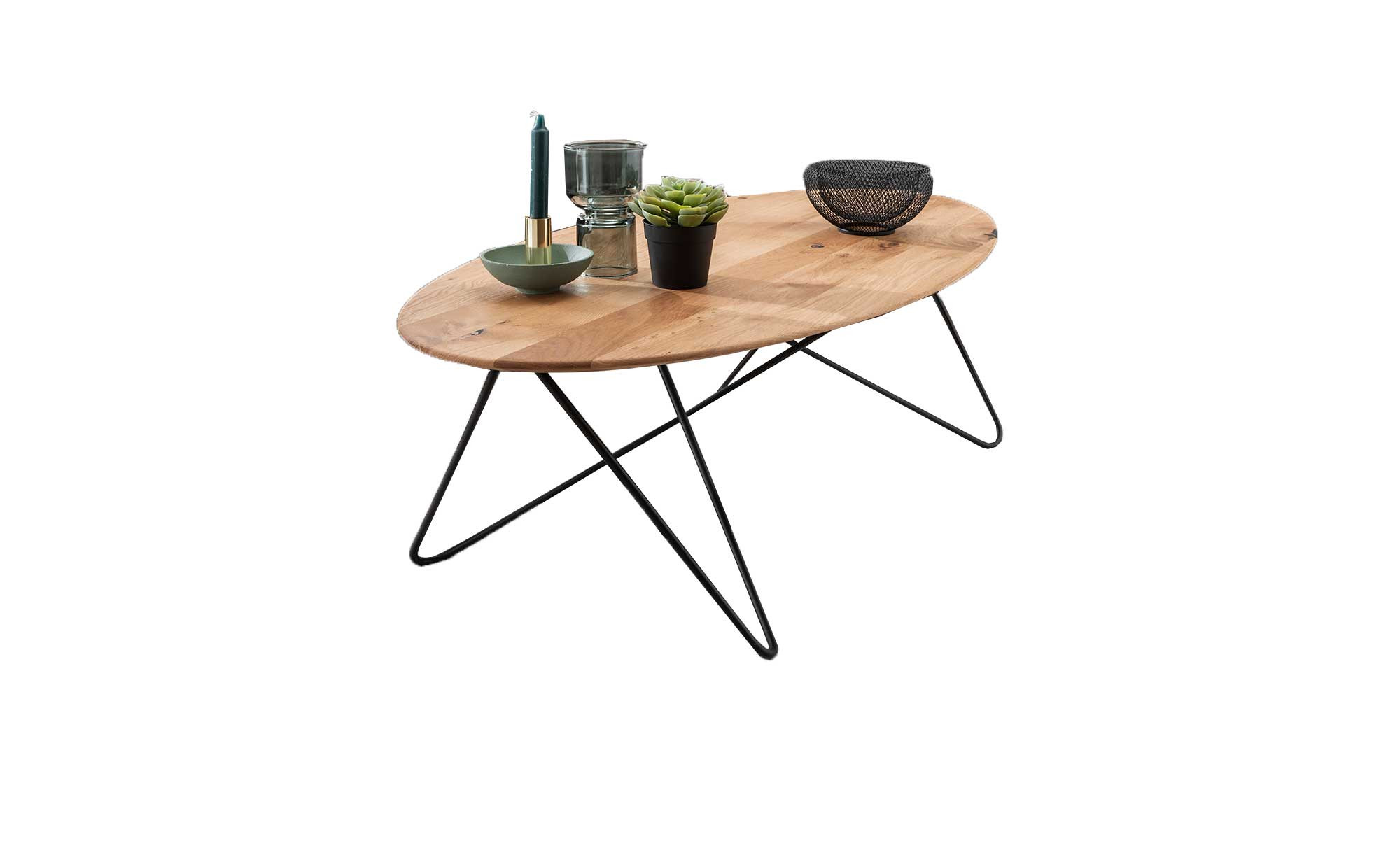 Die ovale Platte des ca. 120 x 36 x 60 cm großen Tischs besteht aus Massivholz. Zusammen mit dem filigranen Gestell aus schwarzem Metall sorgt sie im Raum für ein einzigartiges Flair. Belastbar ist der Couchtisch mit max. 15 kg.