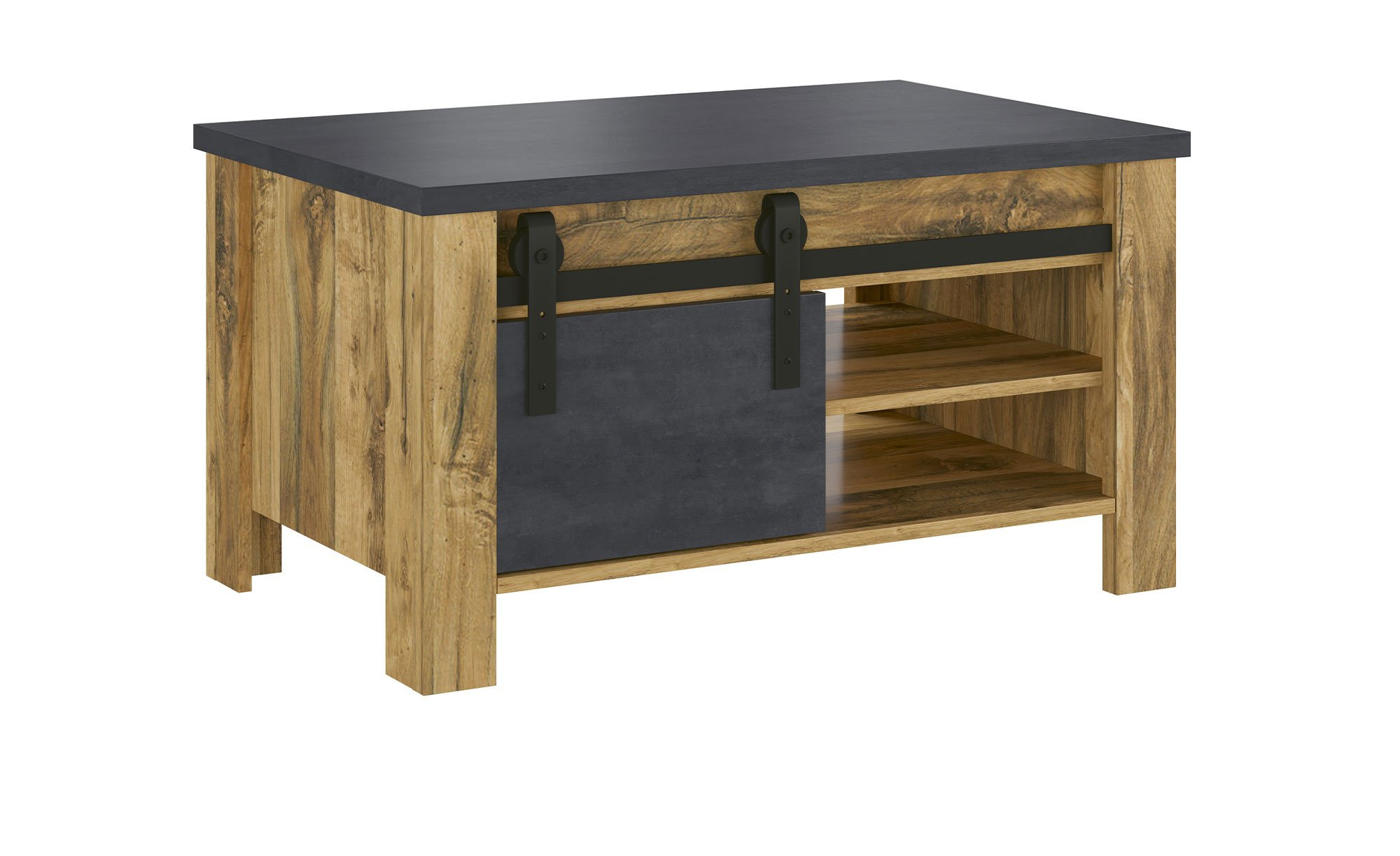 Während das Gestell des ca. 93 x 51 x 60 cm großen Tischs aus melaminbeschichteten Holzwerkstoff in Hunton Eiche dekor besteht, überzeugt die rechteckige Platte aus Holzwerkstoff im harmonierenden Dekor Anthrazit. Eine Beschichtung mit Melaminharz schützt sie zuverlässig vor Kratzern und sonstigem Verschleiß.