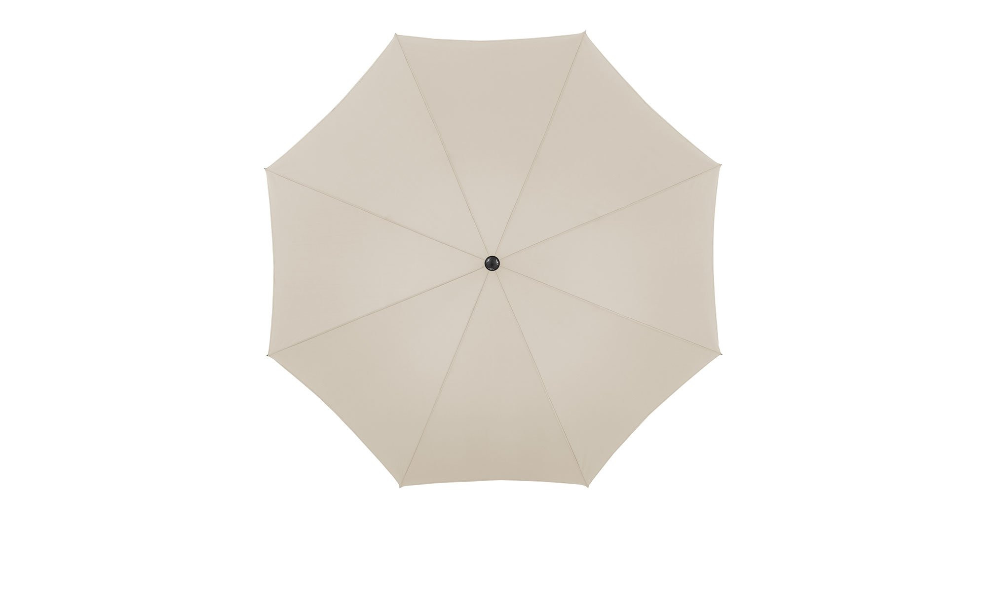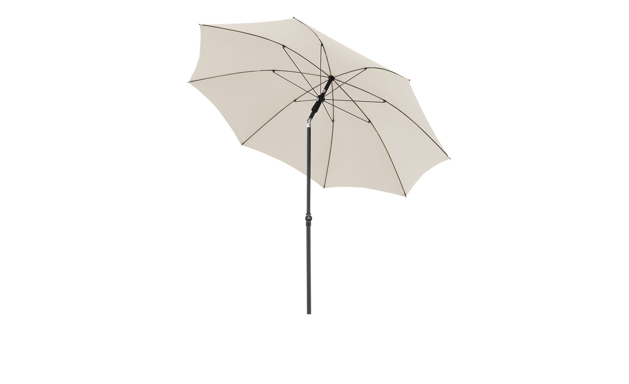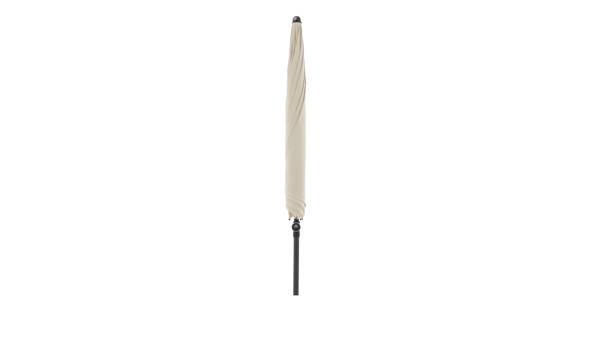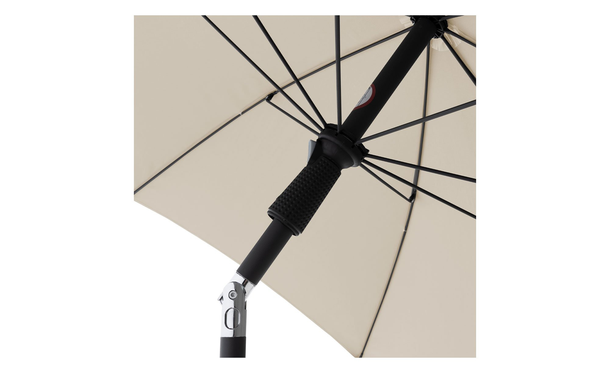 Mit seinem anthrazitfarbigen Aluminiumgestell sorgt der ca. 210 x 237 x 210 cm große Schirm für ein modernes Flair unter freiem Himmel. Es lässt sich je nach Bedarf in der Höhe verstellen und ist zudem knickbar. Der Schirmstoff besteht aus 100 % Polyester und wird in der Farbe Natur geliefert. Neben seinen wasserabweisenden Eigenschaften schützt er Sie mit LSF 50+ auch effektiv vor aggressiver Strahlung. Die Lichtechtheit beträgt dabei 5+. Per Handwäsche können Sie den Stoff ganz einfach reinigen.