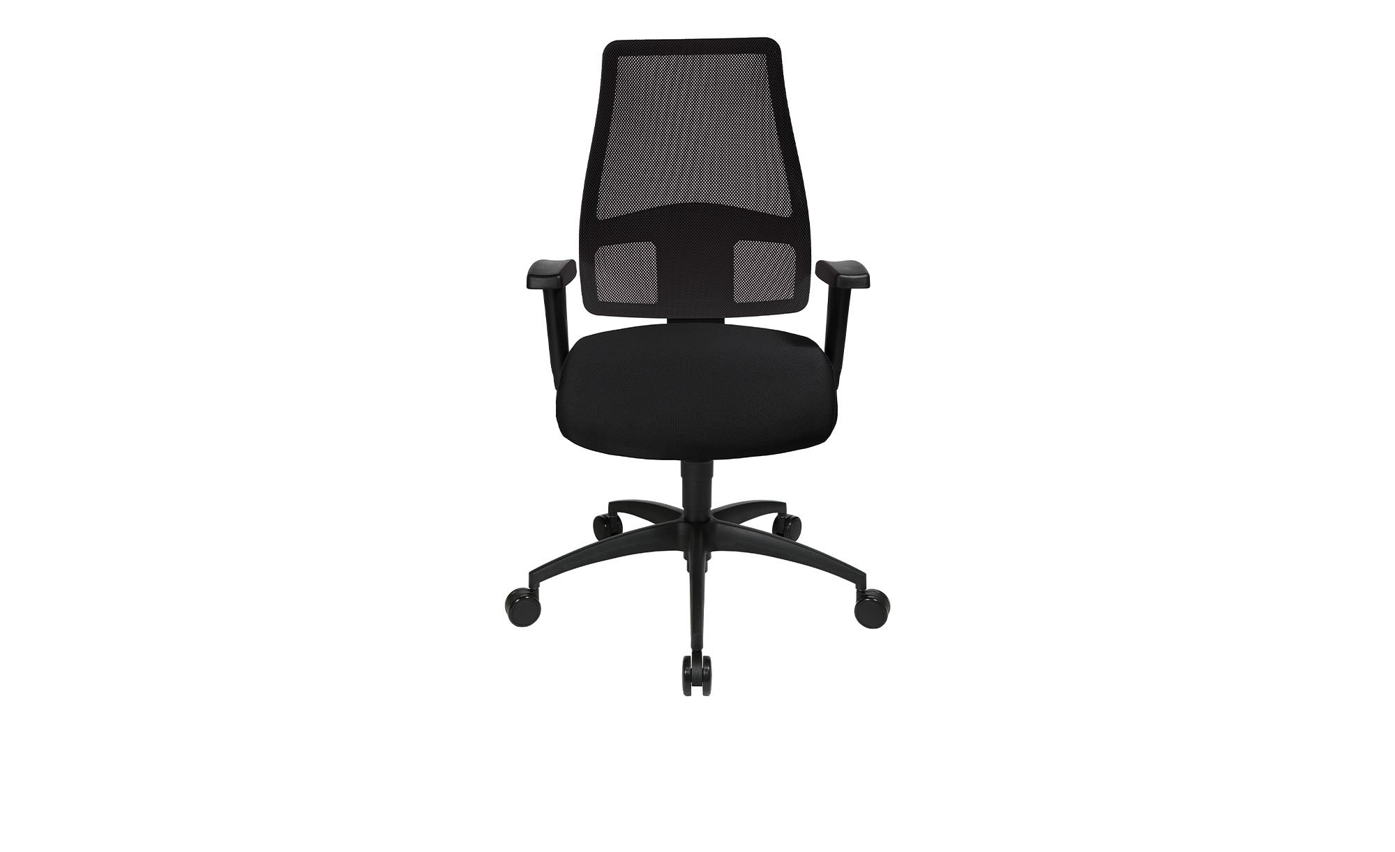 Mit seinem schwarzen Webstoff aus 100 % Polyester und einem dazu passenden, atmungsaktiven Netzbezug am Rücken präsentiert sich der ca. 70 x 113-118 x 70 cm große Drehstuhl als wahrer Eyecatcher. Das Gestell mit Design-Fußkreuz aus schwarzem Polyamid kann sich ebenfalls absolut sehen lassen. Neben höhenverstellbaren und in fünf Positionen arretierbaren Armlehnen wurden auch lastabhängig gebremste Sicherheitsdoppelrollen für Teppichböden integriert.